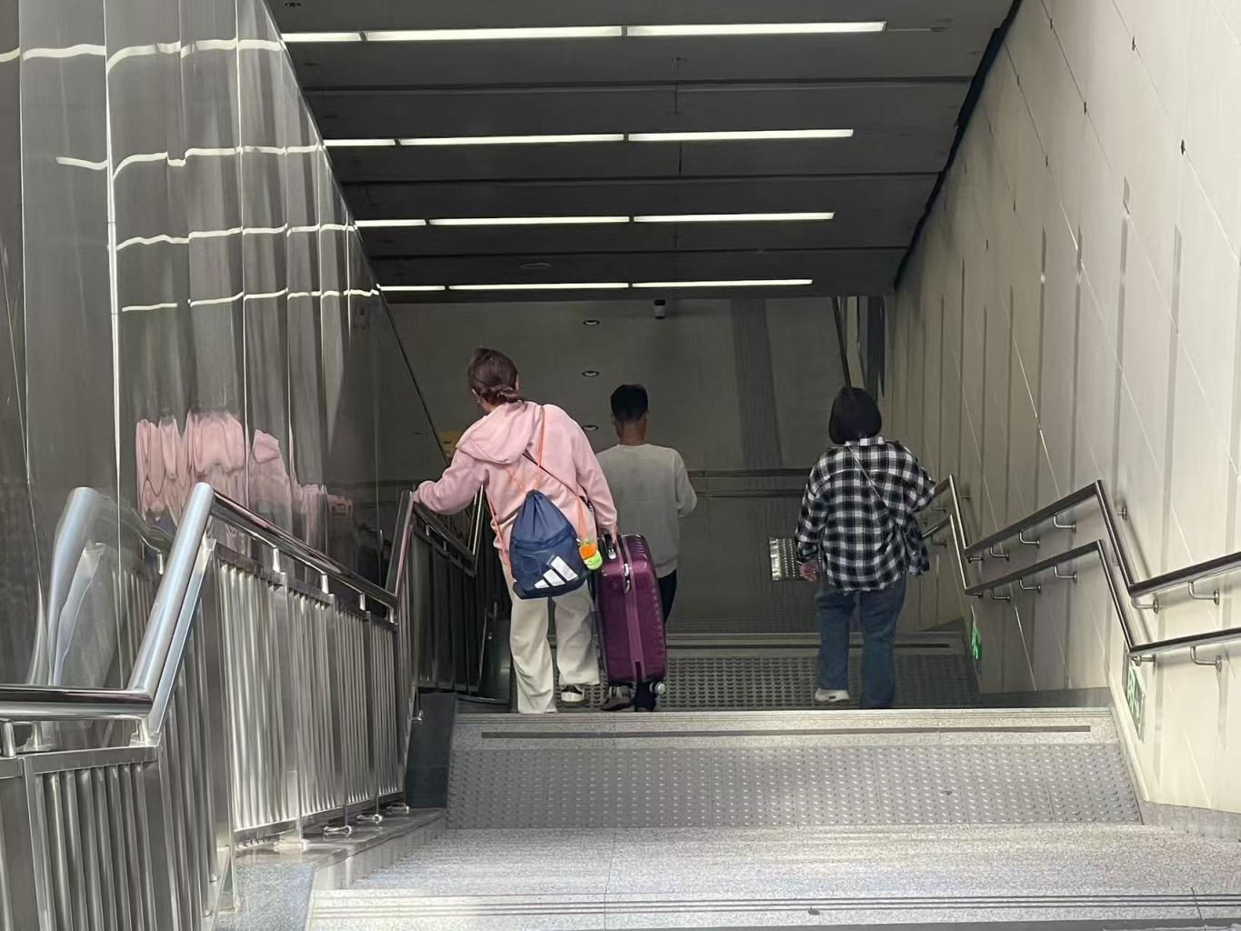 她先是来到马路东侧一个地铁口,发现同样只有上行扶梯;折返后询问路人,被指向北边较远的地铁口,跑过去查看,仍然只有上行扶梯。几经辗转,她才在马路东侧另一地铁口南侧找到一部直梯。