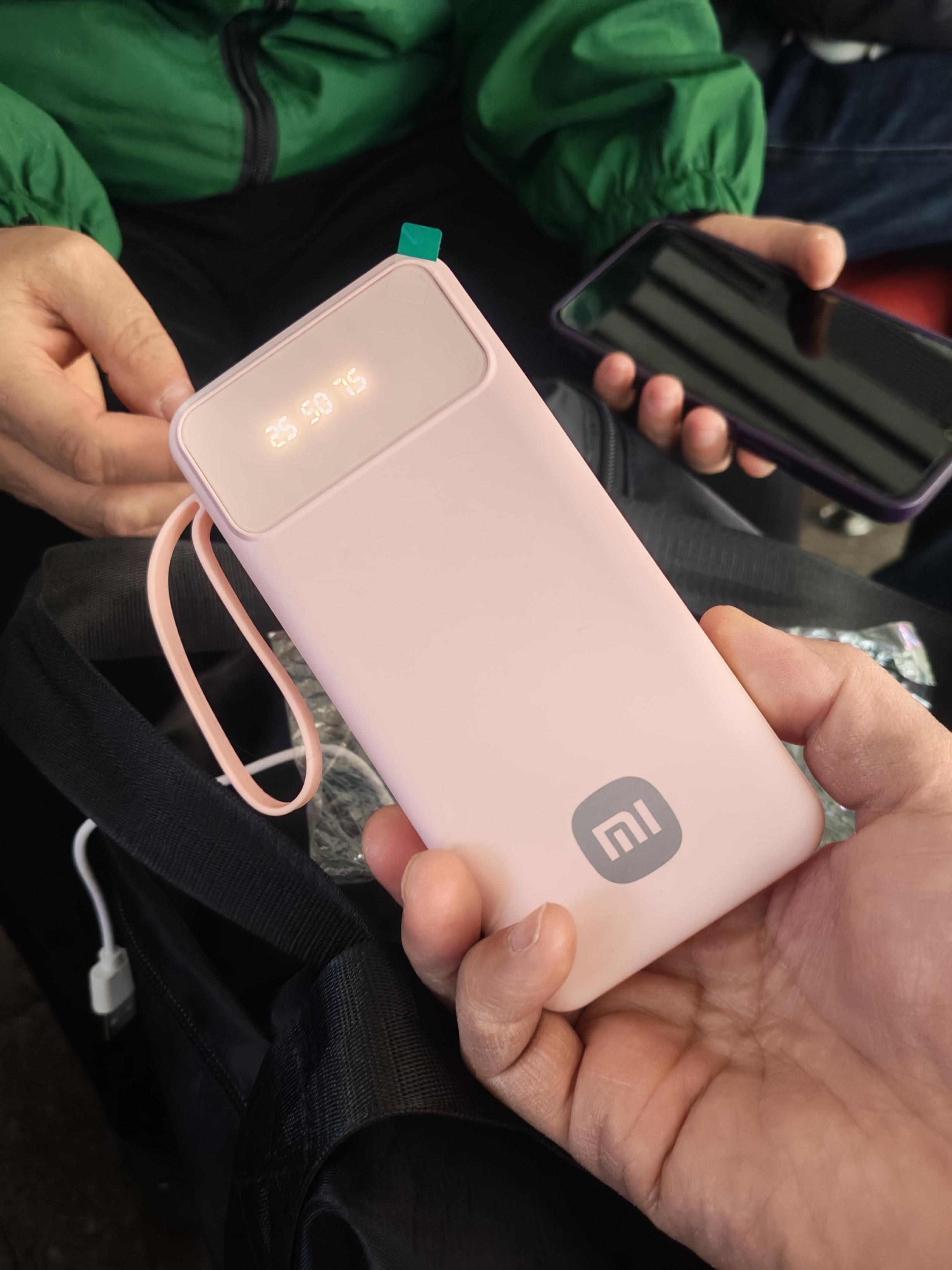 “这个充电宝不行啊,一插一拔,就掉了25%的电。”现场购买充电宝的旅客,很快便发现了质量问题。这款“小米”充电宝,商贩要价55元,她最终花40元购买,标注容量为20000毫安,同样是用一层透明塑料纸包裹。刚使用了一小会儿,充电宝屏幕上显示的电量数值,就从“100%”掉到了“75%”,这名旅客有些着急,感到自己被骗了,“怎么办呢?哪里还能找到他们?”