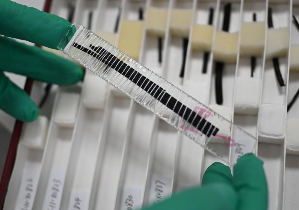 荆州文物保护中心简牍工作室工作人员处理竹简残片。新华社记者 程敏 摄