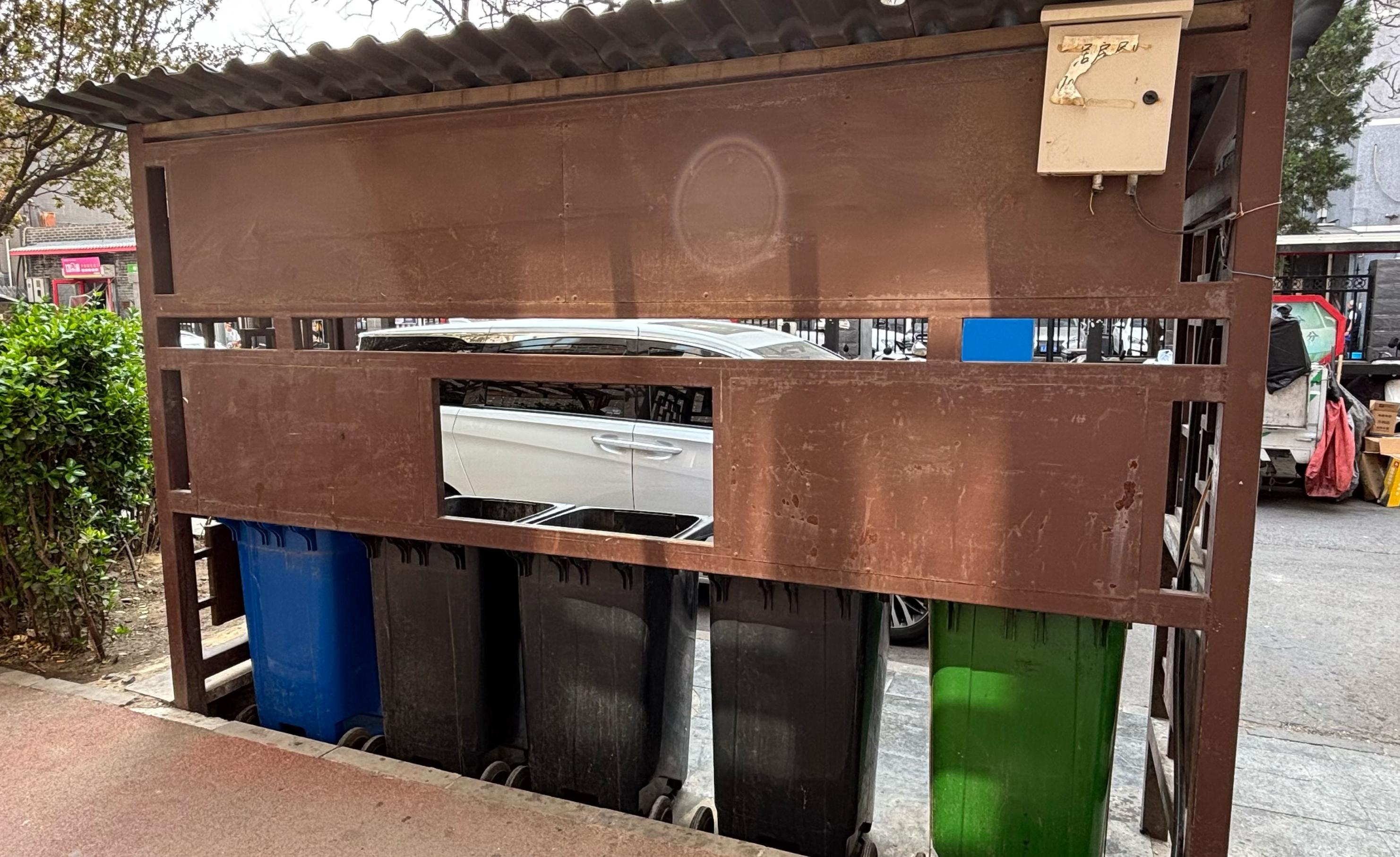 在东城区新革路北口,一座小小“凉亭”以刷成红棕色的钢板作为框架,内里摆放着一排共5个垃圾桶。分别为1个投放厨余垃圾的绿桶、1个投放可回收物的蓝桶,以及3个投放其他垃圾的黑桶。“凉亭”的顶部还安装了深灰色瓦片,看上去既古色古香,与胡同风格一致,又能为下方的垃圾桶遮风避雨。