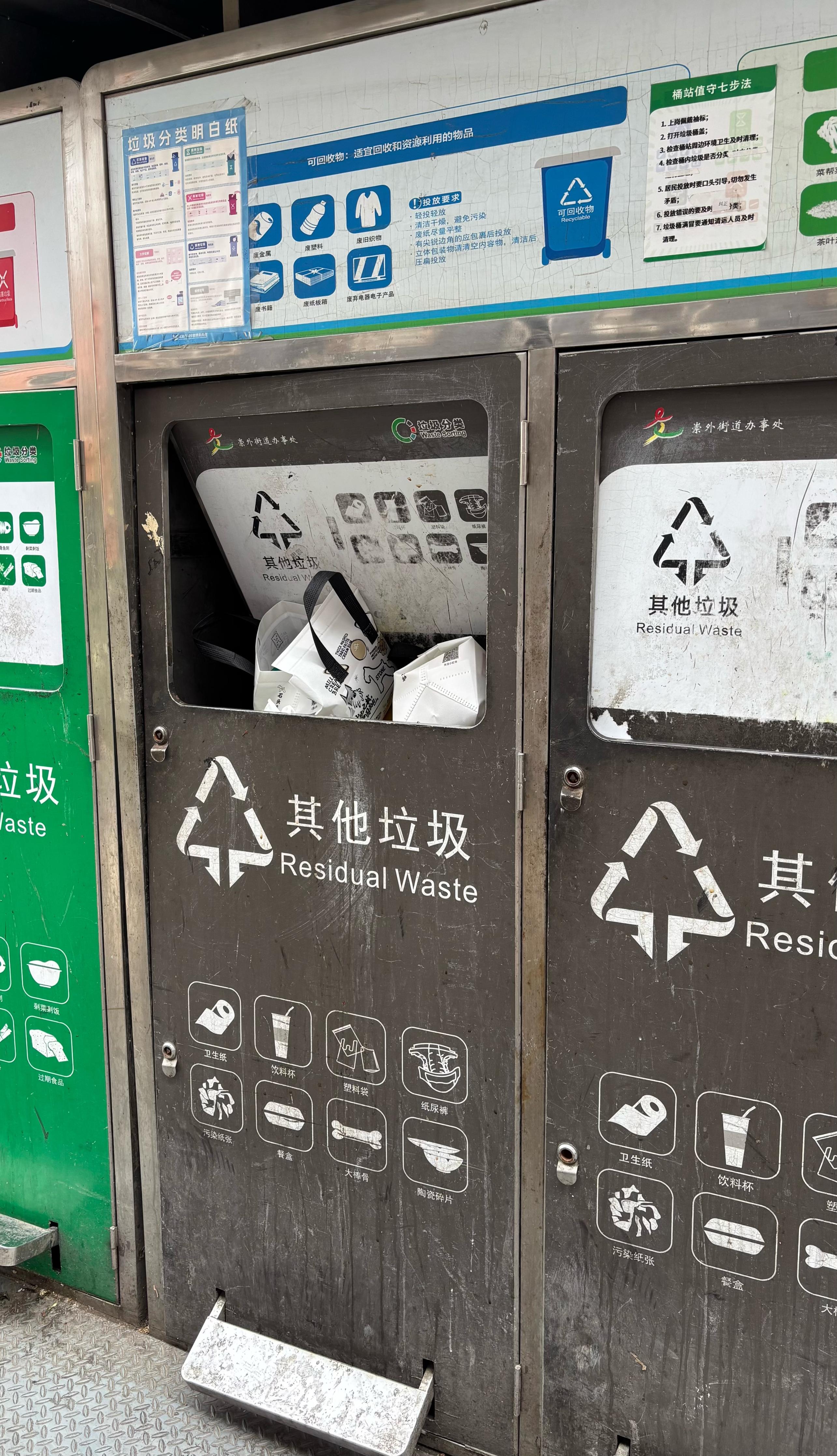 不过在使用中,记者发现此类垃圾桶的盖子经常处于向后弯折,甚至被直接取下的状态,便于保洁人员冲洗垃圾桶,或给垃圾桶套垃圾袋。如新革路北口的垃圾桶站,仅厨余垃圾桶盖上了盖子,其余垃圾桶均是敞口放置。从用意上来讲,这样的做法可以理解——厨余垃圾气味较大,盖上盖子比较卫生。其余的垃圾桶如果不扔厨余垃圾,日常敞口似也无妨。