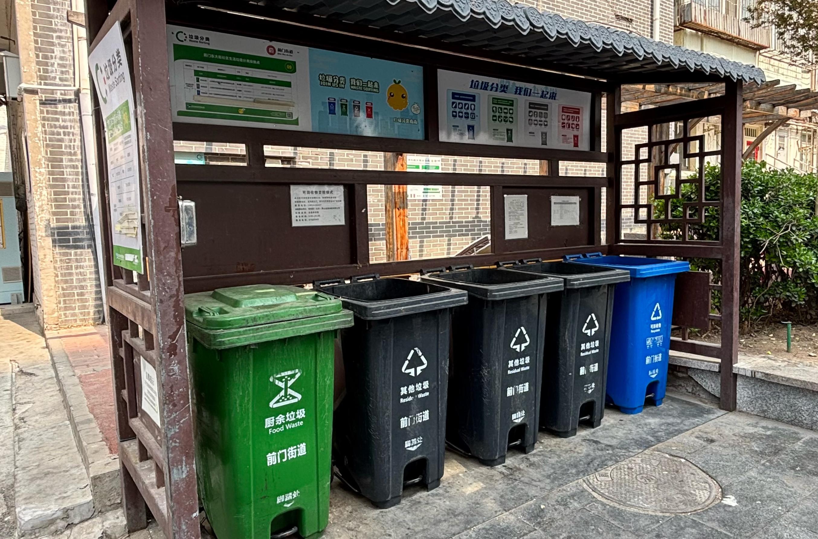 除了传统塑料垃圾桶,如今整体性更强的箱房式垃圾桶站,在很多小区也十分常见。它们通常被设计为一组铁皮柜的样式,下方有门,保洁人员可以将垃圾桶挪进挪出。上方则设置为内开式投放口,可以直接用手推开,或踩住铁皮柜下端的踏板控制开关。