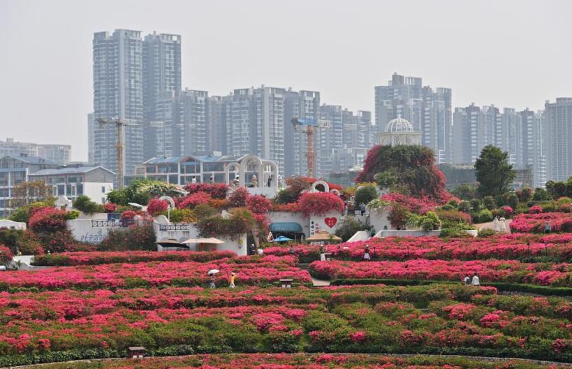 这是南宁市青秀山盛开的鲜花及附近建筑楼群(2026年4月12日摄)。