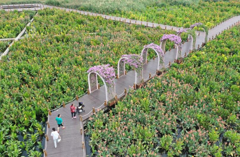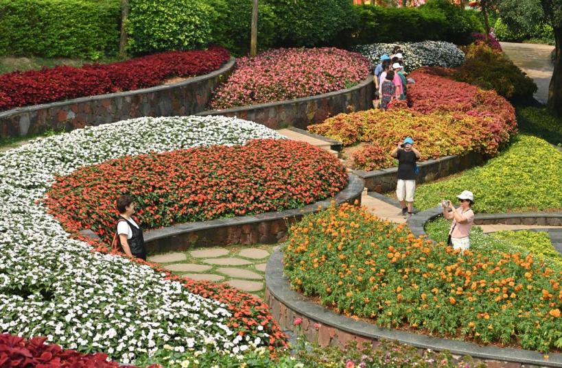 人们在南宁市青秀山欣赏盛开的鲜花(2026年4月12日摄)。