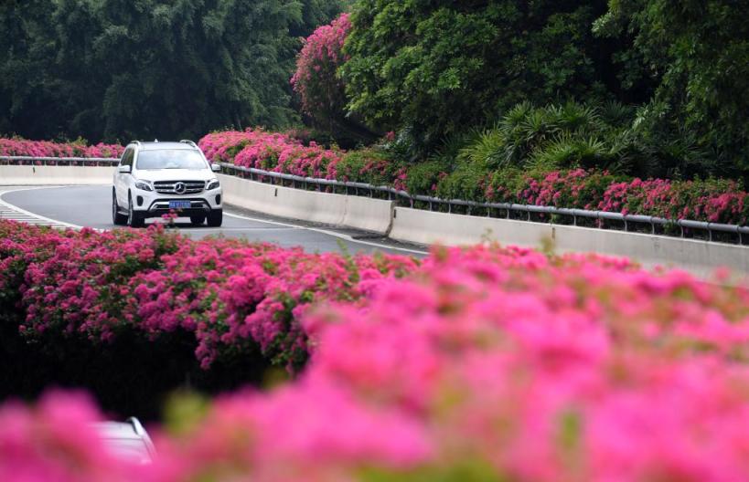 车辆从开满鲜花的南宁市竹溪大道经过(2019年8月31日摄)。