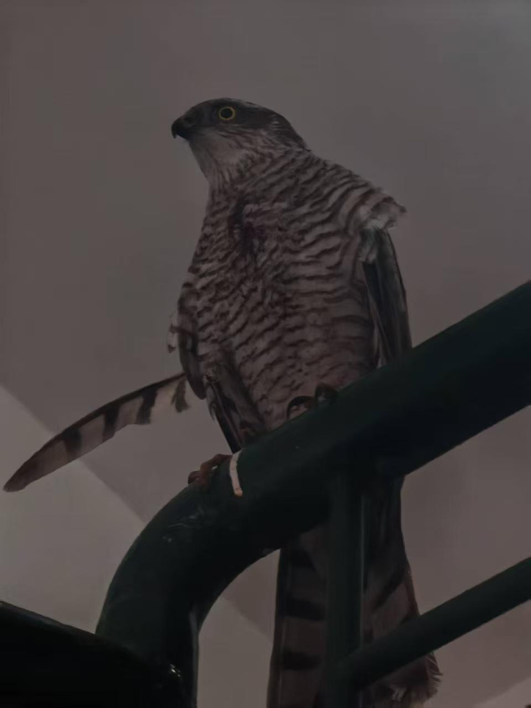 随后,朱华静拨打光明派出所报警电话求助。民警接警后即刻抵达现场开展核查。最终,民警确认,这只“大鸟”是国家二级重点保护动物雀鹰,需专业救援人员进行安全捕捉,随即联动消防救援人员、区园林绿化局野生动物救助站工作人员到场处置。
