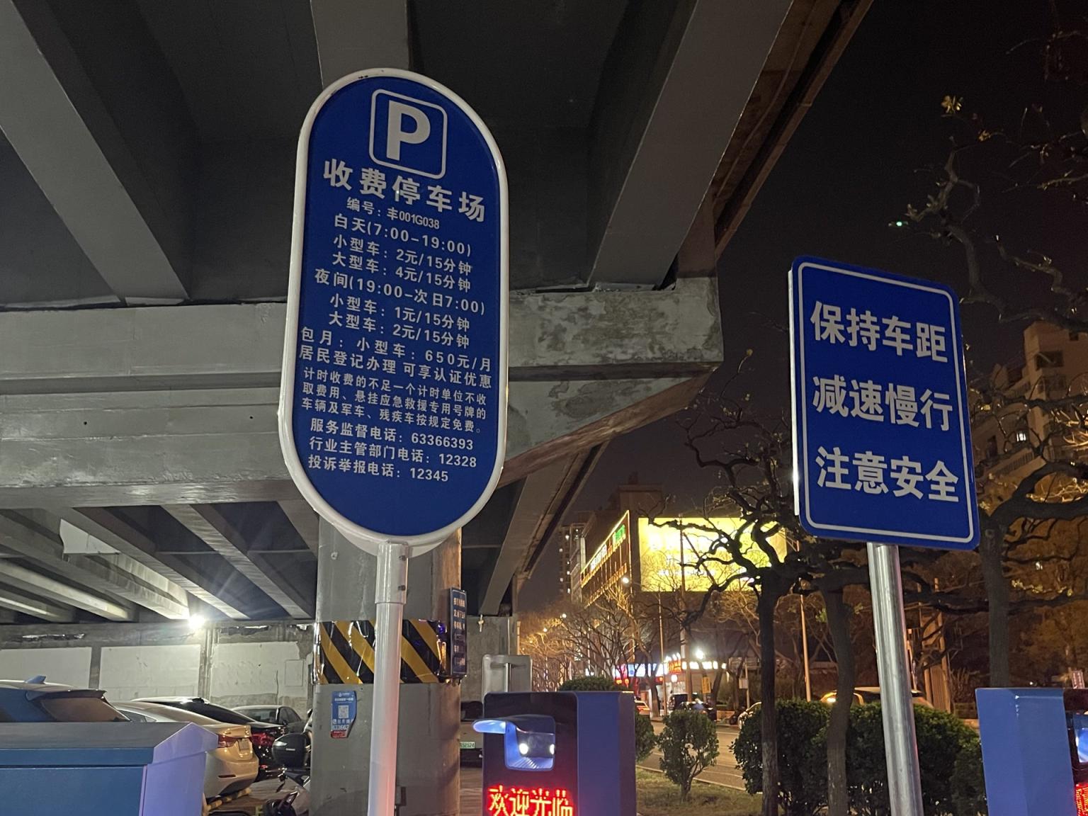 刘家窑桥东西两侧桥下空间经过改造,共释放出186个车位。晚上8点记者实地探访时,车辆停放率已达七八成,仍有车辆陆续驶入。桥东侧停车场配备了4个充电车位,可满足新能源汽车充电需求。出入口收费公示牌载明:小型车白天(7:00-19:00)2元/15分钟,夜间(19:00-次日7:00)1元/15分钟,非居民包月650元/月。