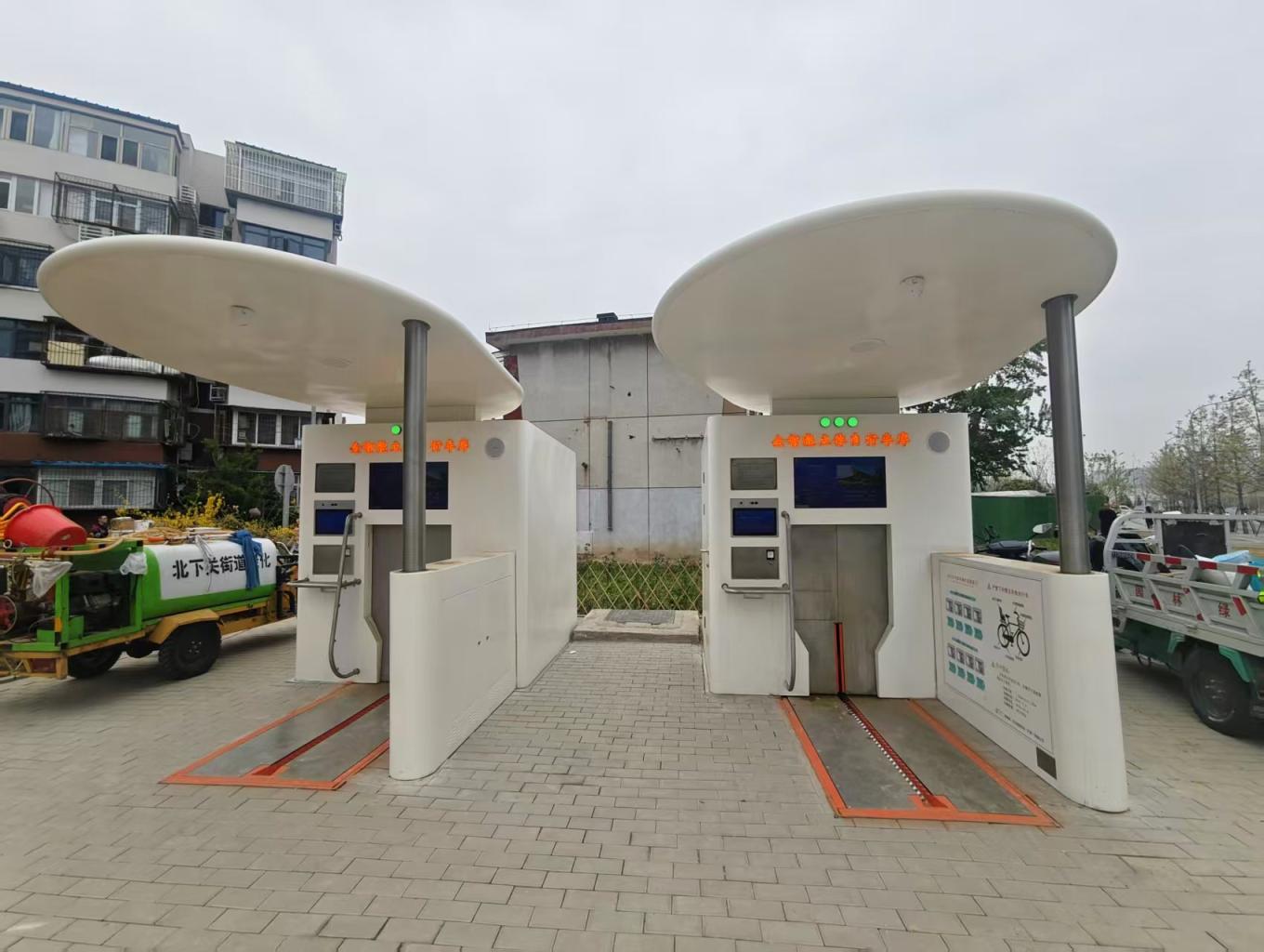 北下关街道打造的自行车地下立体智能停车库,从地面上看好像两座白色的小亭子,每个小亭子由一个方形建筑和一个椭圆形探出的顶棚构成。
