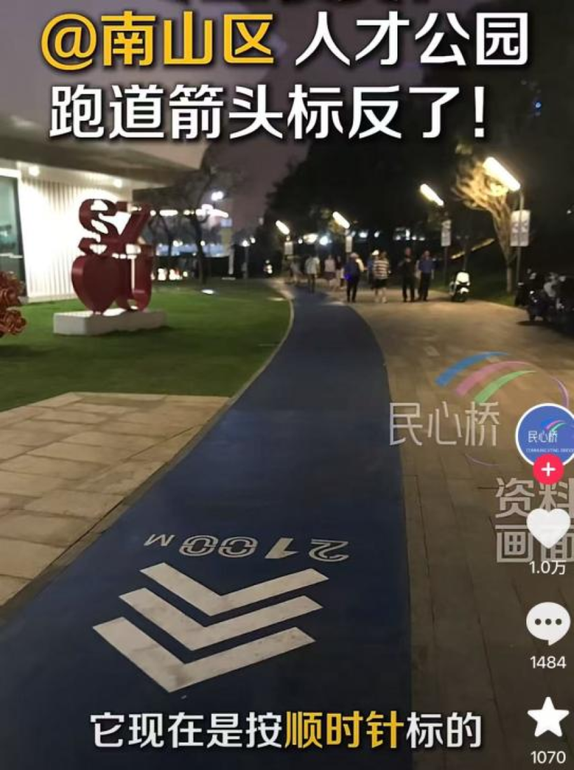 近日,深圳南山区人才公园一段环形跑道引发热议。有网友通过短视频平台“投诉”称,该公园内2.5公里的专业塑胶跑道,跑步方向指引箭头全部标注为顺时针,与大众普遍习惯的逆时针方向完全相悖,质疑箭头“标反了”。