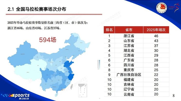 《蓝皮书》公布,全国范围内在2025年共举办马拉松赛事594场,全程马拉松为235场,占比39.56%,半程马拉松为359场,占比60.44%。这一总数较2024年的696场同比下降约14.7%。在减少的102场中,半程马拉松占了83场。形成对比的是,中国田协认证赛事(A、B类)比2024年呈现小幅增长。这类赛事共举办341场,包括193场全程马拉松和148场半程马拉松。