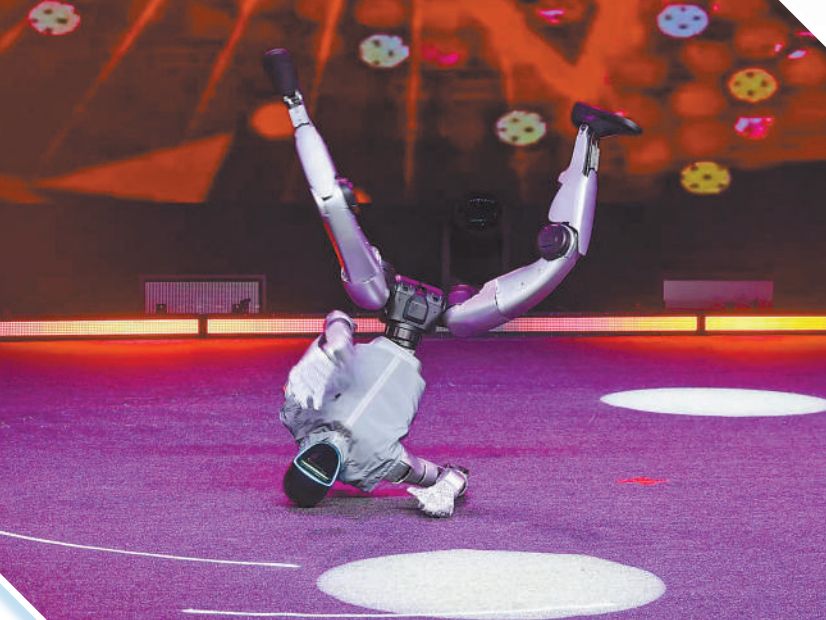 在首届国际人形机器人街舞邀请赛上,机器人表演街舞动作“大风车”。刘 峥摄