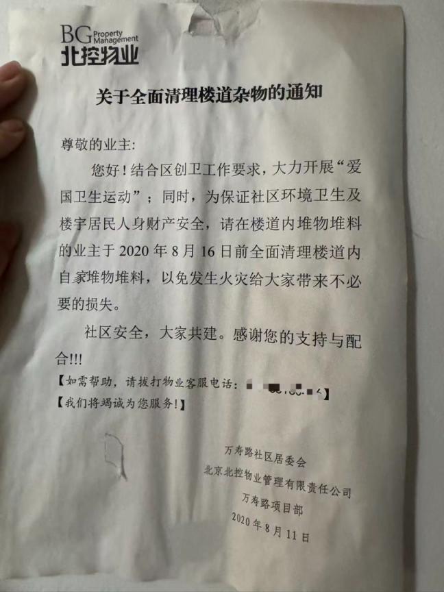 万寿路大件厂小区居民也有同样的困扰。记者在小区5号楼4单元看到,几乎每一层楼梯拐角处都有杂物堆放。在二三层楼梯拐角处,柜子、泡沫塑料箱、帆布袋、扫帚等杂物占了近一半的通道,原本约1米宽的通道仅剩不足半米可供人通过。而8号楼3单元北侧的住户,几乎家家户户都将自家门旁约2米长、50厘米宽的空间视作私人空间,堆放了纸箱、铁柜子、塑料盒、鞋盒等杂物。更有居民围着这片空间修了铁栅栏,在家门外建起了二道门。在杂物周边,还贴有街道城管执法大队和社区居委会共同发出的清理通知,通知上的落款有2020年、2023年等多个版本,如今却和这些杂物共处一个空间内,沦为一纸空文。
