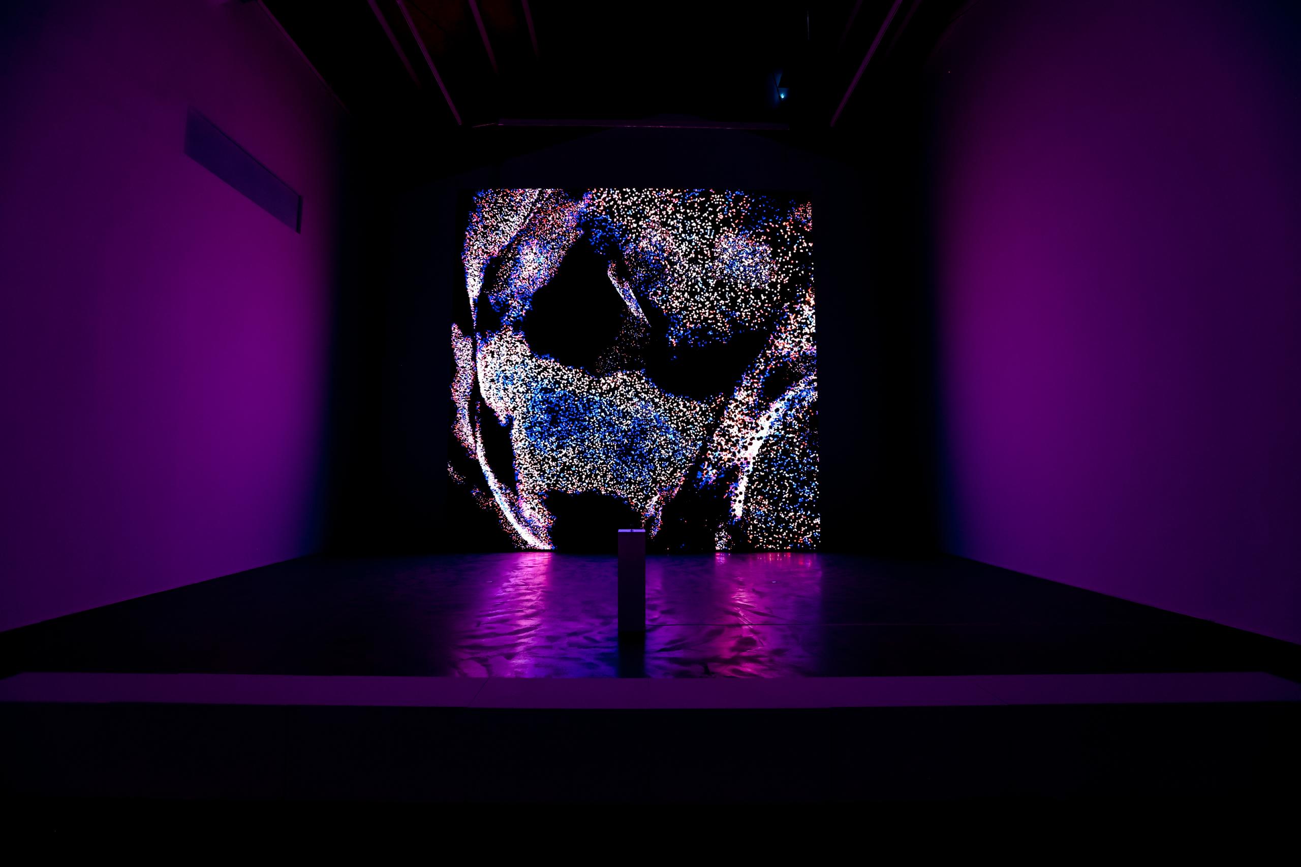 此次展览中,《体积》以色彩的涨落模糊了人造与自然,令人思索真实与虚拟、有机与无机的边界,成为展览的前奏。步入核心展厅,7x7米巨型LED屏幕呈现的交互装置《游境》让观众化身为宇宙的探索者,穿越于四个抽象生物群落。在VR项目《模块》中,观众将参与新世界的探索与共造,预演人类与数字主体的共存。最终,《元素》将一切纷繁归于黑白粒子。