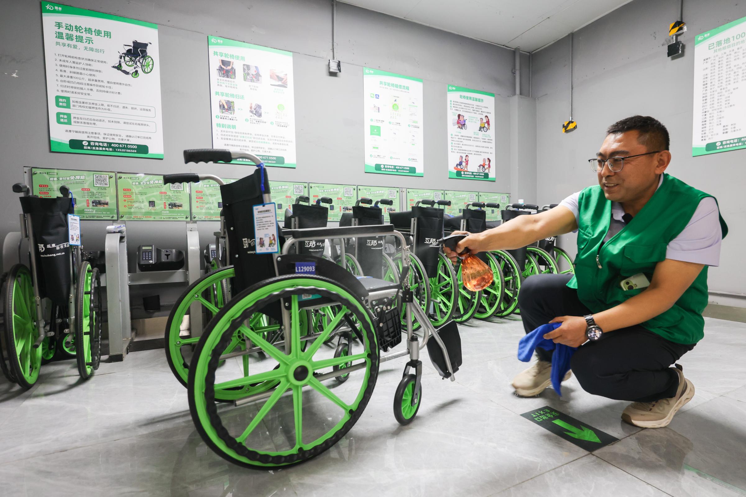 现场穿绿色马甲的工作人员正在进行消毒。“轮椅每天都会消毒,轮椅归还后,我们也会进行清洁。”工作人员介绍。