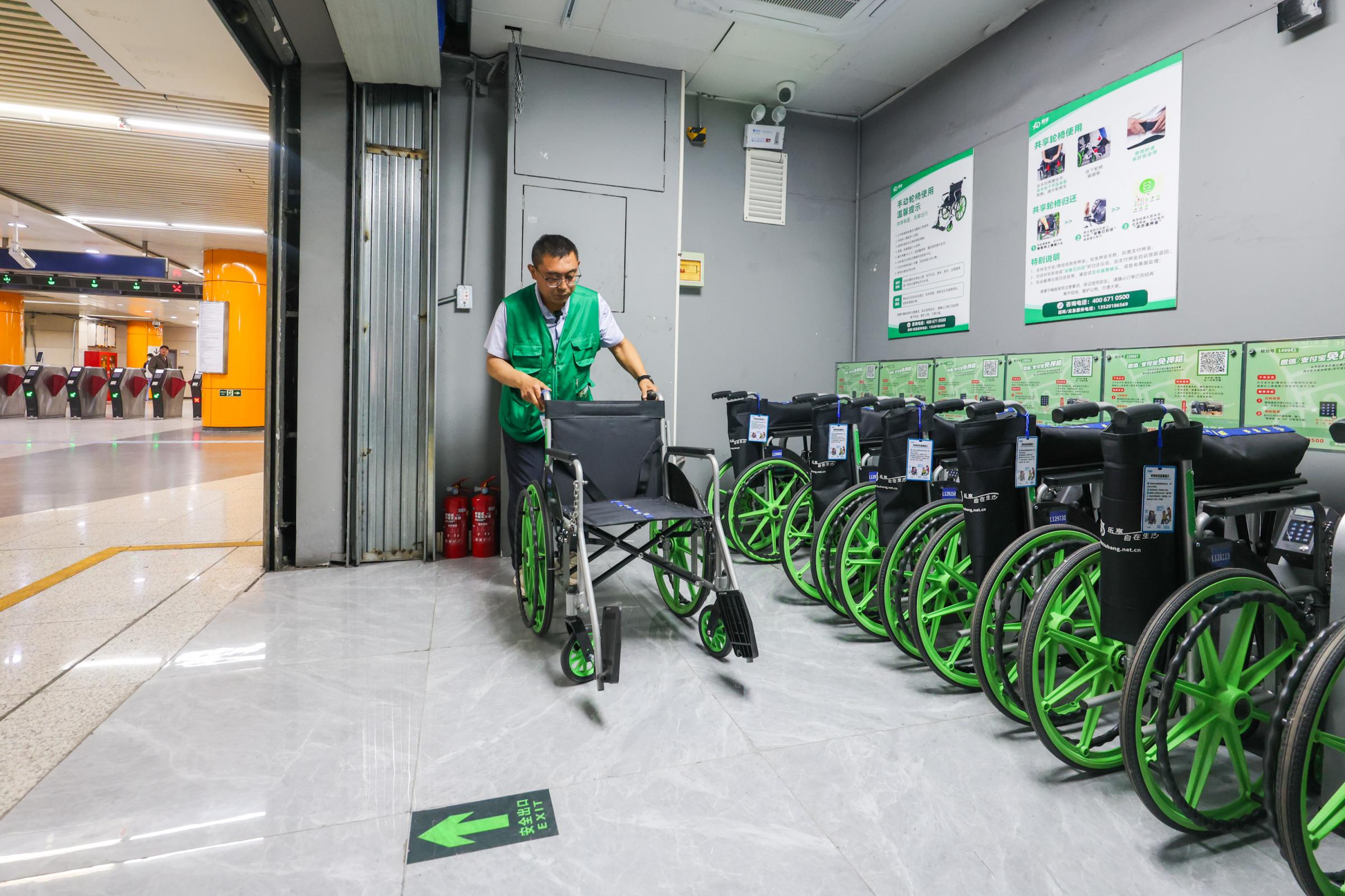 今天,记者来到5号线东单站南站厅看到,G口旁新设置了一处共享轮椅·便民服务驿站,一排绿色的手动轮椅整齐停放,随时可供有需要的乘客租借,乘客只需打开微信或支付宝,扫描桩位上的二维码,就可以解锁使用轮椅。
