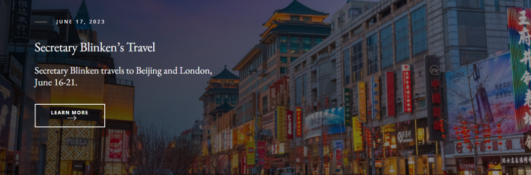 澎湃新闻记者注意到,美国国务院网站有关布林肯访华的介绍文章的背景图片是中国的街景,并出现在首页上。