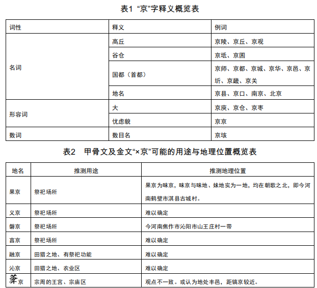 在甲骨文中,“京”字常以单字“京”或复合词“×京”的形式出现。胡厚宣主编的《甲骨文合集释文》收录的卜辞中,“京”与“×京”反复出现。从卜辞内容推断,单字“京”应为一处地名,既为祭天祈雨之场所,又是田猎的苑囿,可能位于殷都附近;复合词“×京”,如:果京、义京、磐京、亯京、融京、沁京等等,或为祭祀场所,或为田猎之地,或为农业区。