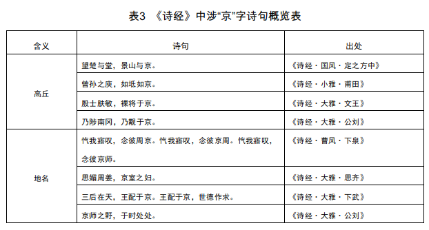 在以《诗经》为代表的先秦文献中,有许多涉及“京”字的诗句,以单字“京”或复合词“×京”“京×”出现。这些诗句中“京”字的含义基本可分为两类:一类是地形名称——高丘;另一类是具体地名,如:镐京、周京、京周、京师等,其中的“京”字多指国都、都城。