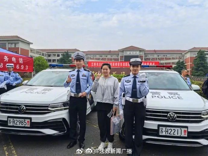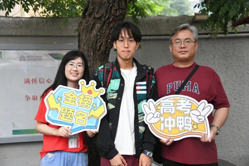 6月7日,在江苏省南京市建邺区中华中学考点,考生与送考人偶击掌。新华社记者 李博 摄