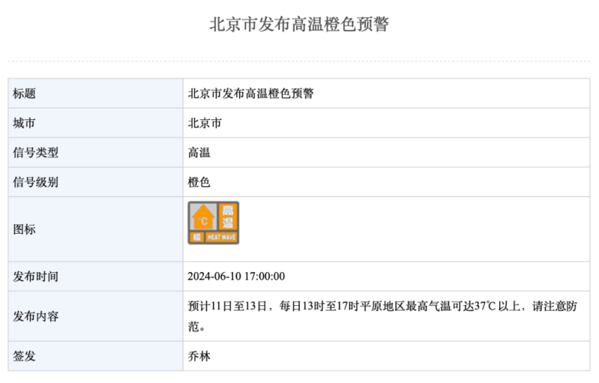 2024年6月10日17时,北京市气象台升级发布高温橙色预警信号:预计11日至13日,每日13时至17时平原地区最高气温可达37℃以上,请注意防范。