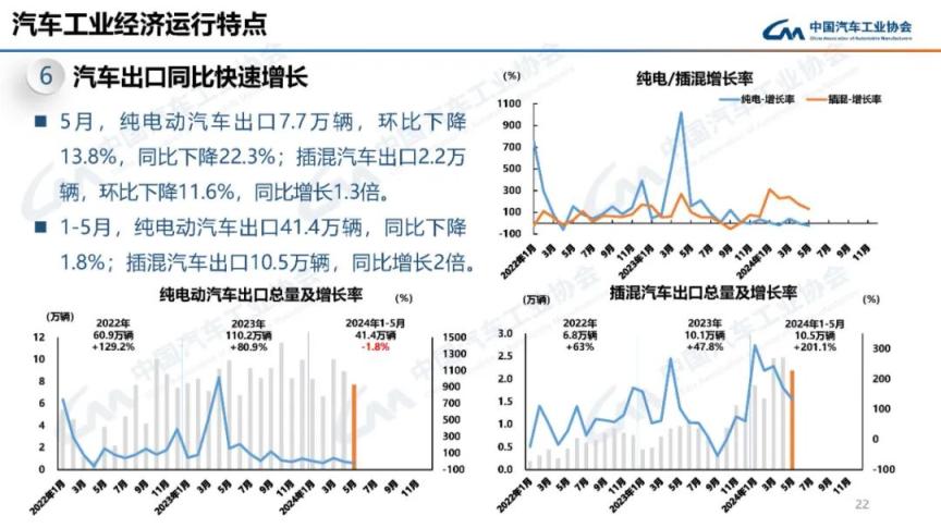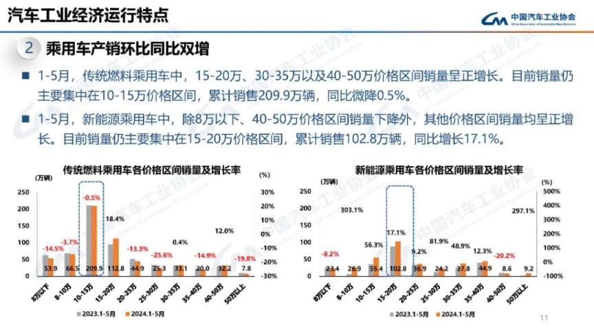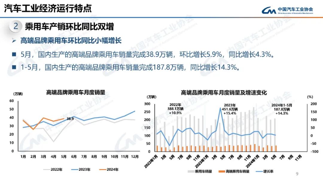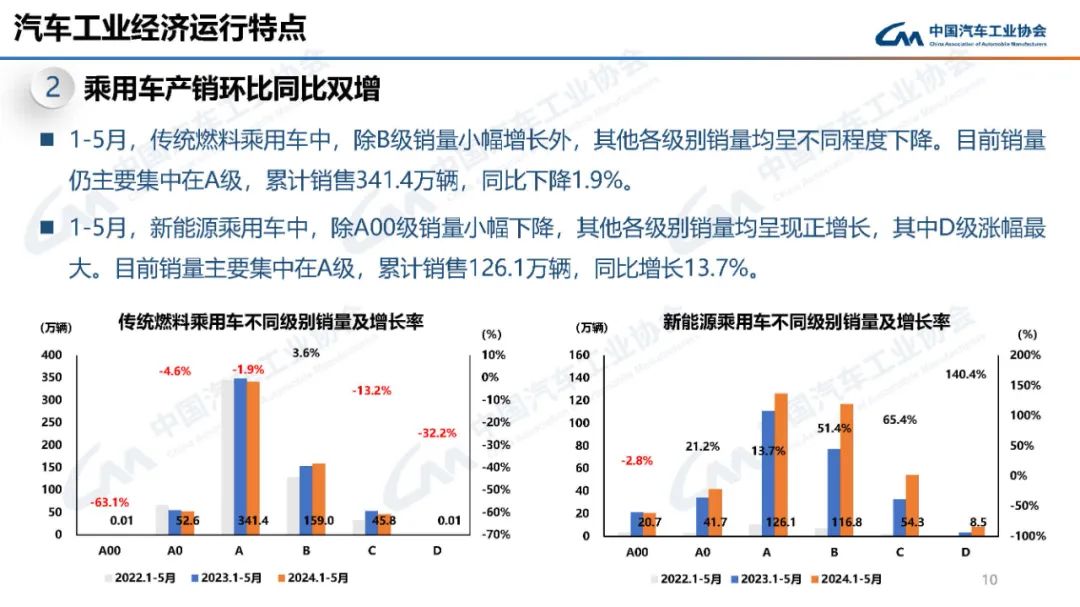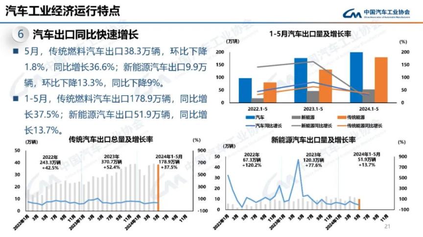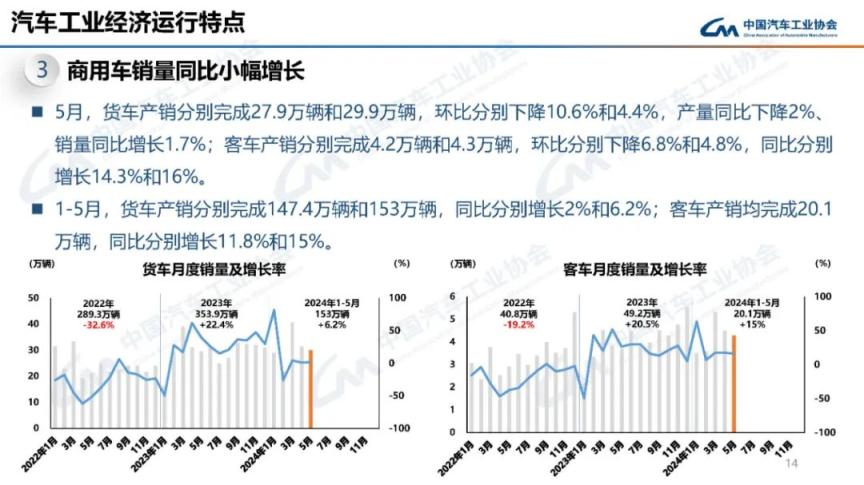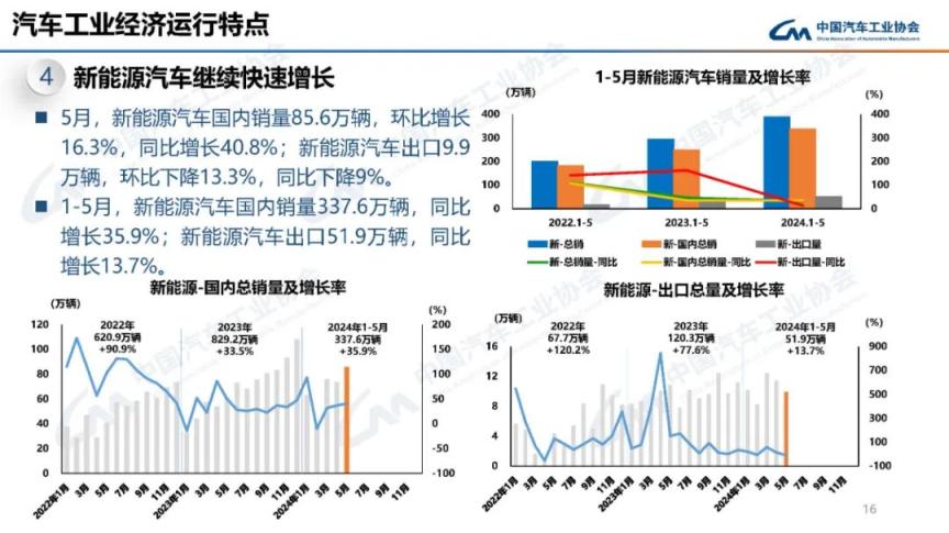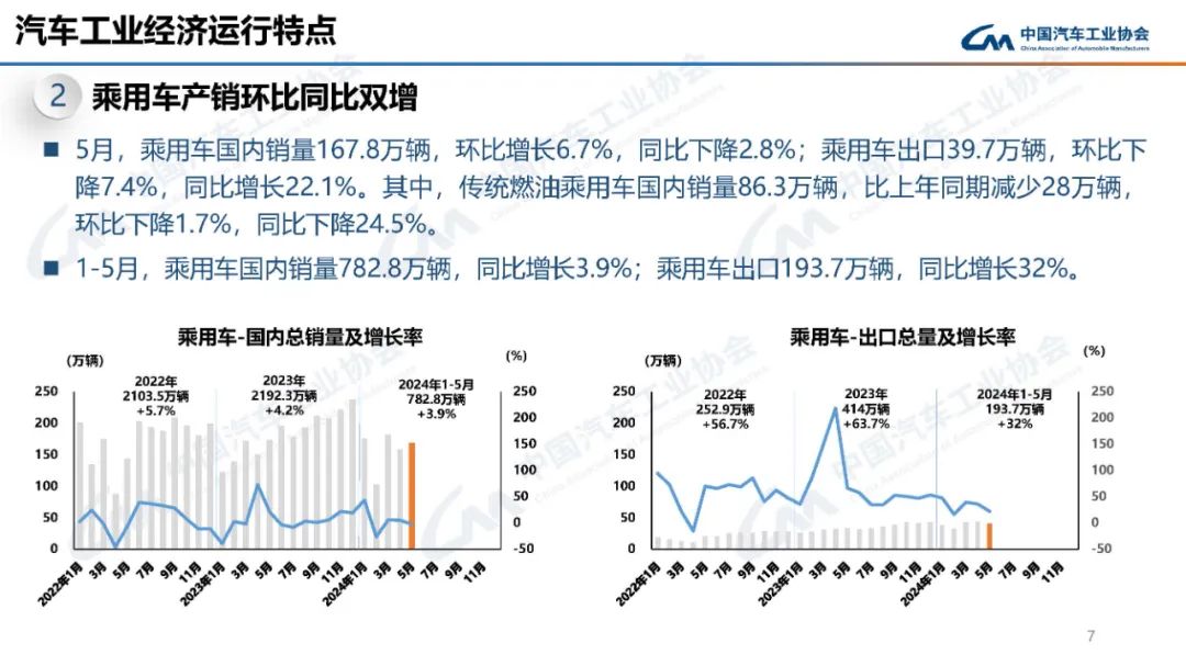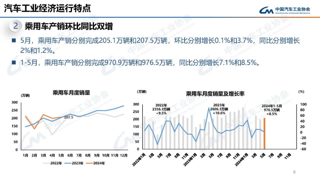 据中国汽车工业协会分析,5月,我国经济总体产出继续扩张,企业生产经营活动保持恢复发展态势。当月,汽车销量环比、同比均实现小幅增长,新能源汽车产销和汽车出口延续快速增长态势,中国品牌也继续保持良好表现。