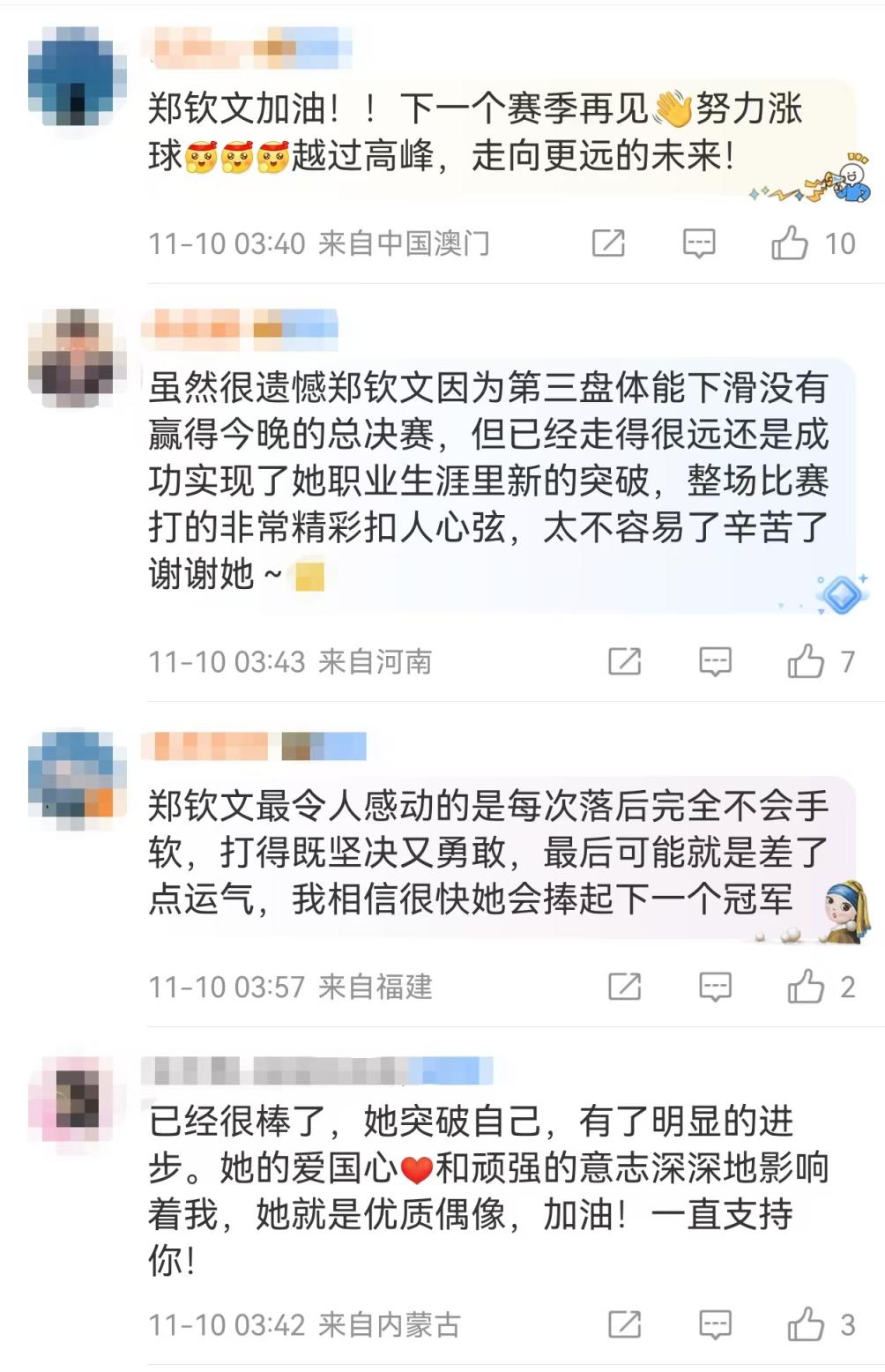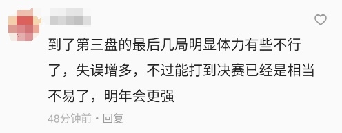 有网友在央视新闻客户端的评论区留言,表示郑钦文“打到决赛已是相当不易,明年会更强”。