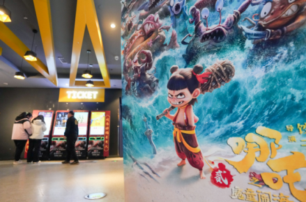 2月6日,在辽宁沈阳一家影院,观众从《哪吒之魔童闹海》海报旁经过。新华社记者 李钢 摄