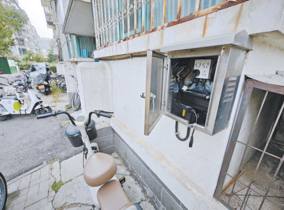 果园西小区有居民在单元门外自行安装了“飞线充电箱”。