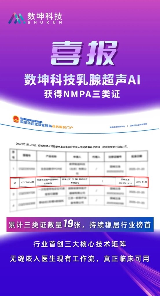 据国家药品监督管理局(NMPA)官网消息,数坤科技自主研发的乳腺病变超声图像辅助检测软件正式获得国家药品监督管理局(NMPA)三类医疗器械注册证。此次获批使数坤科技累计持有NMPA三类证数量增至19张,持续稳居获证数量榜首,进一步巩固行业领军地位。