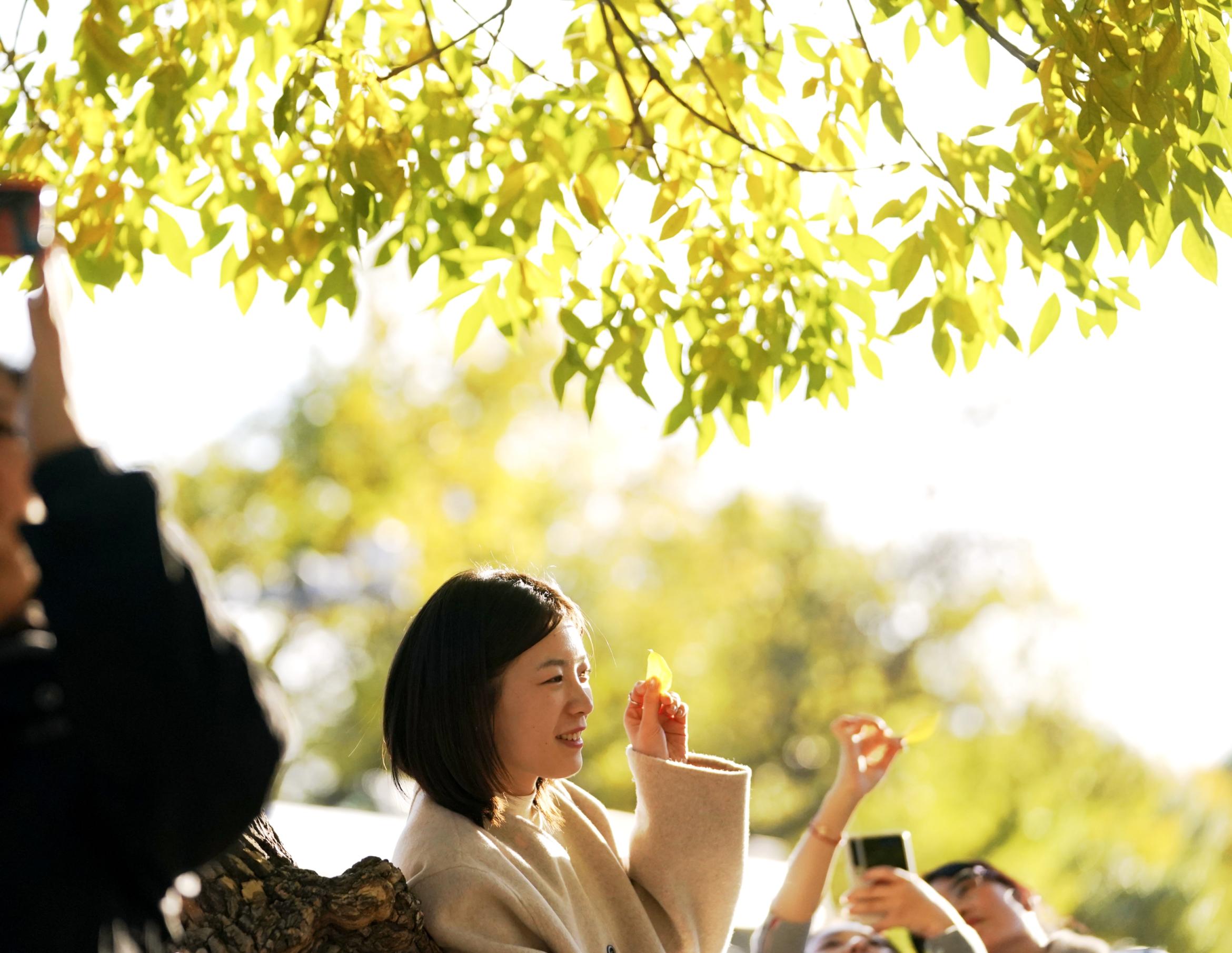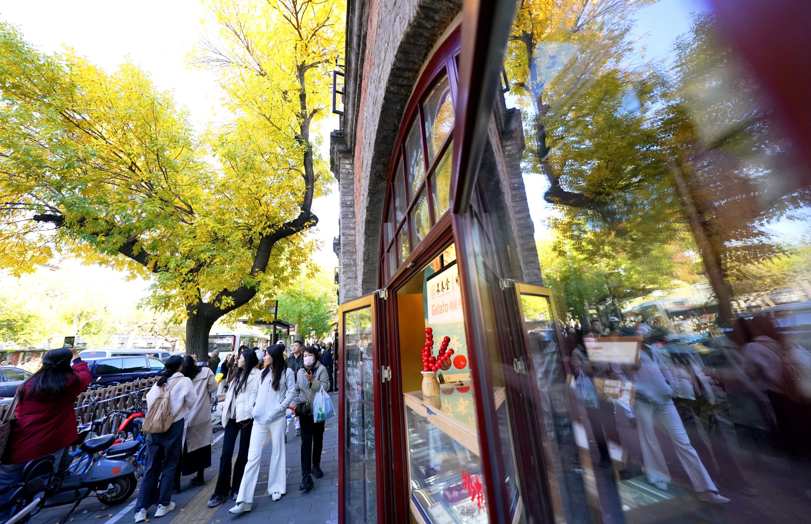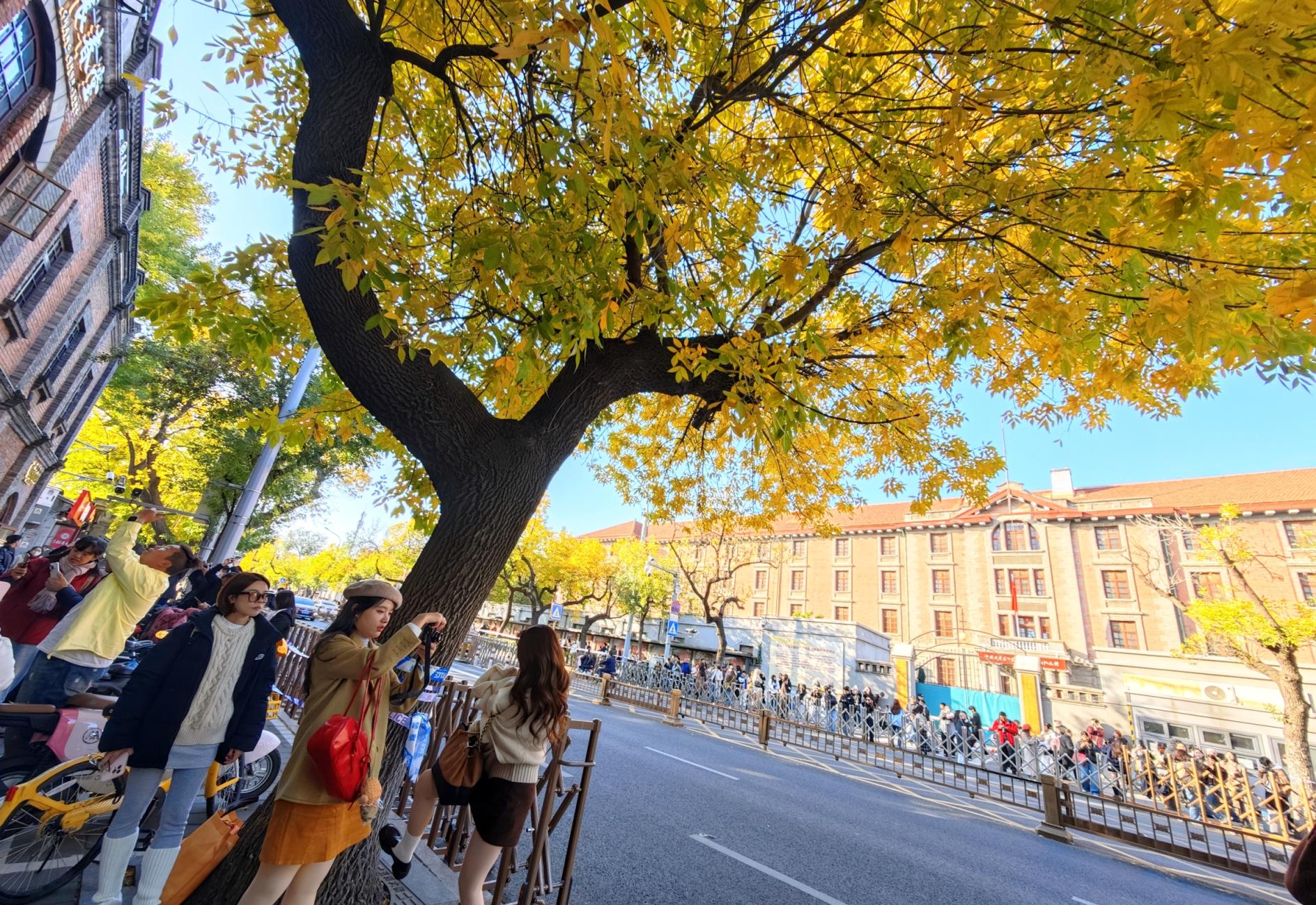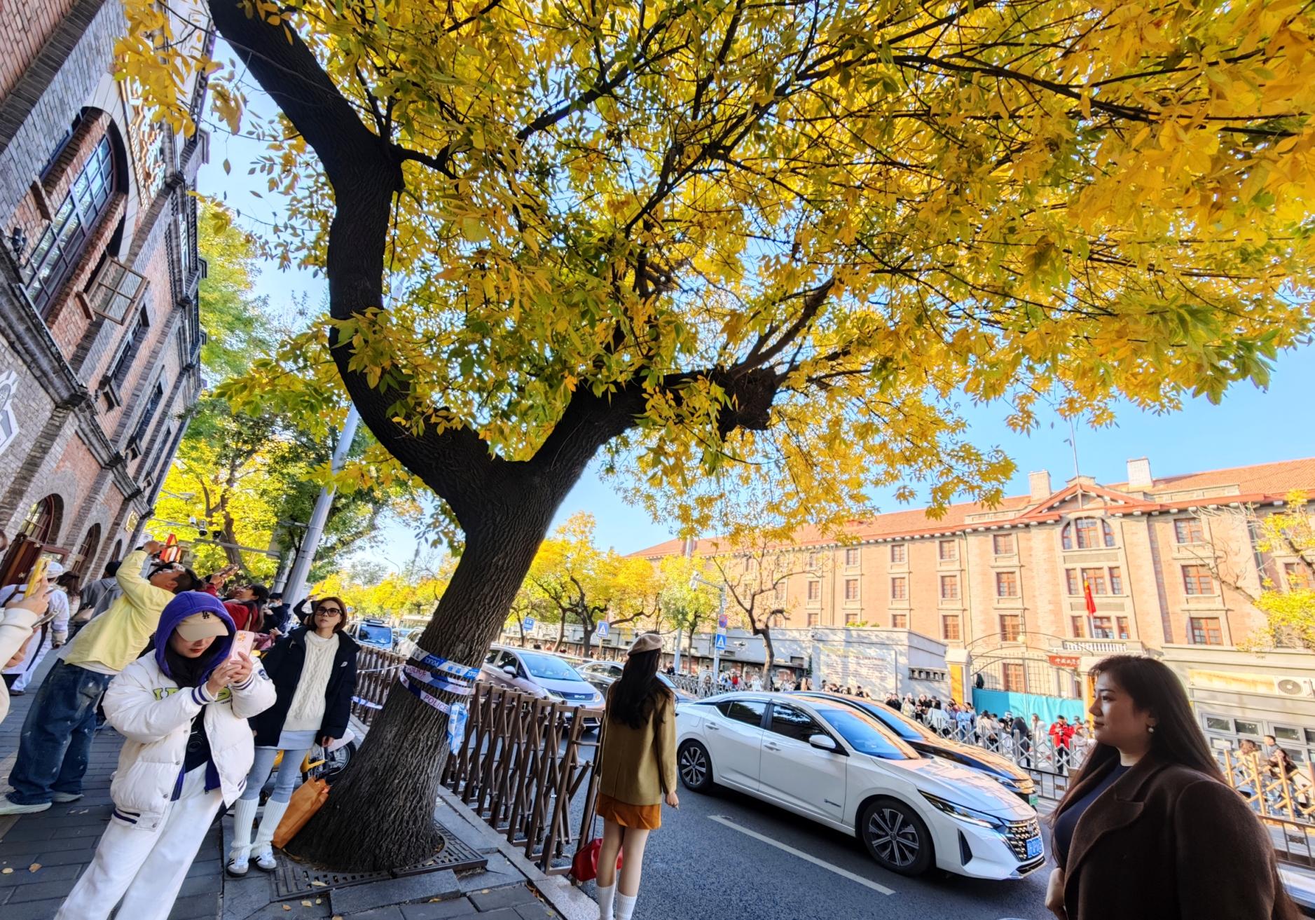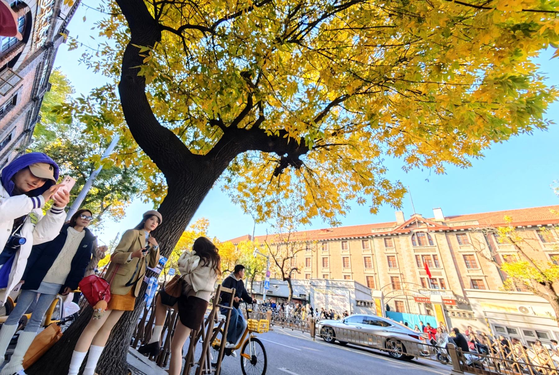漫步街头,阳光透过枝叶洒下斑驳光影,落叶随风轻舞,为这条承载着五四精神的街道增添了几分诗意。不少市民驻足拍照留念,感受秋日独特魅力。