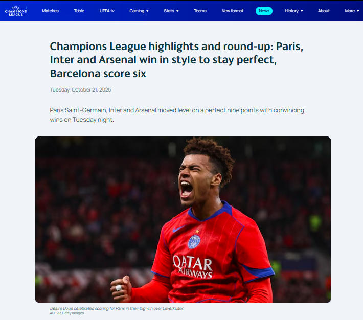 北京时间10月22日凌晨,本赛季欧冠联赛第一阶段(联赛阶段)第三轮首个比赛日迎来进球盛宴。9场比赛累计打入43球,多场强强对话打出大比分:上届冠军法甲巴黎圣日耳曼队客场7比2狂胜德甲勒沃库森队、西甲冠军巴塞罗那队主场6比1击溃希腊奥林匹亚科斯队、荷甲埃因霍温队主场6比2大胜意甲冠军那不勒斯队。