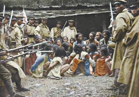 1914年,日军镇压少数民族抗暴。“太鲁阁事件”中,日军用刺刀吓唬老弱妇孺,摆拍纪念照。