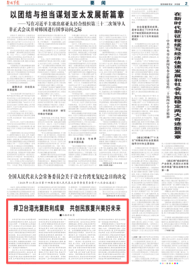 今年是中国人民抗日战争暨世界反法西斯战争胜利80周年,也是台湾光复80周年。十四届全国人大常委会第十八次会议10月24日经表决,通过了关于设立台湾光复纪念日的决定,以法律形式将10月25日设立为台湾光复纪念日,并规定国家通过多种形式举行纪念活动。设立台湾光复纪念日,在国家层面举行纪念活动,有利于体现台湾是中国不可分割一部分这一无可辩驳的历史事实,巩固国际社会坚持一个中国的格局,引领两岸同胞传承、弘扬伟大抗战精神,激励全体中华儿女为祖国统一、民族复兴而团结奋斗。