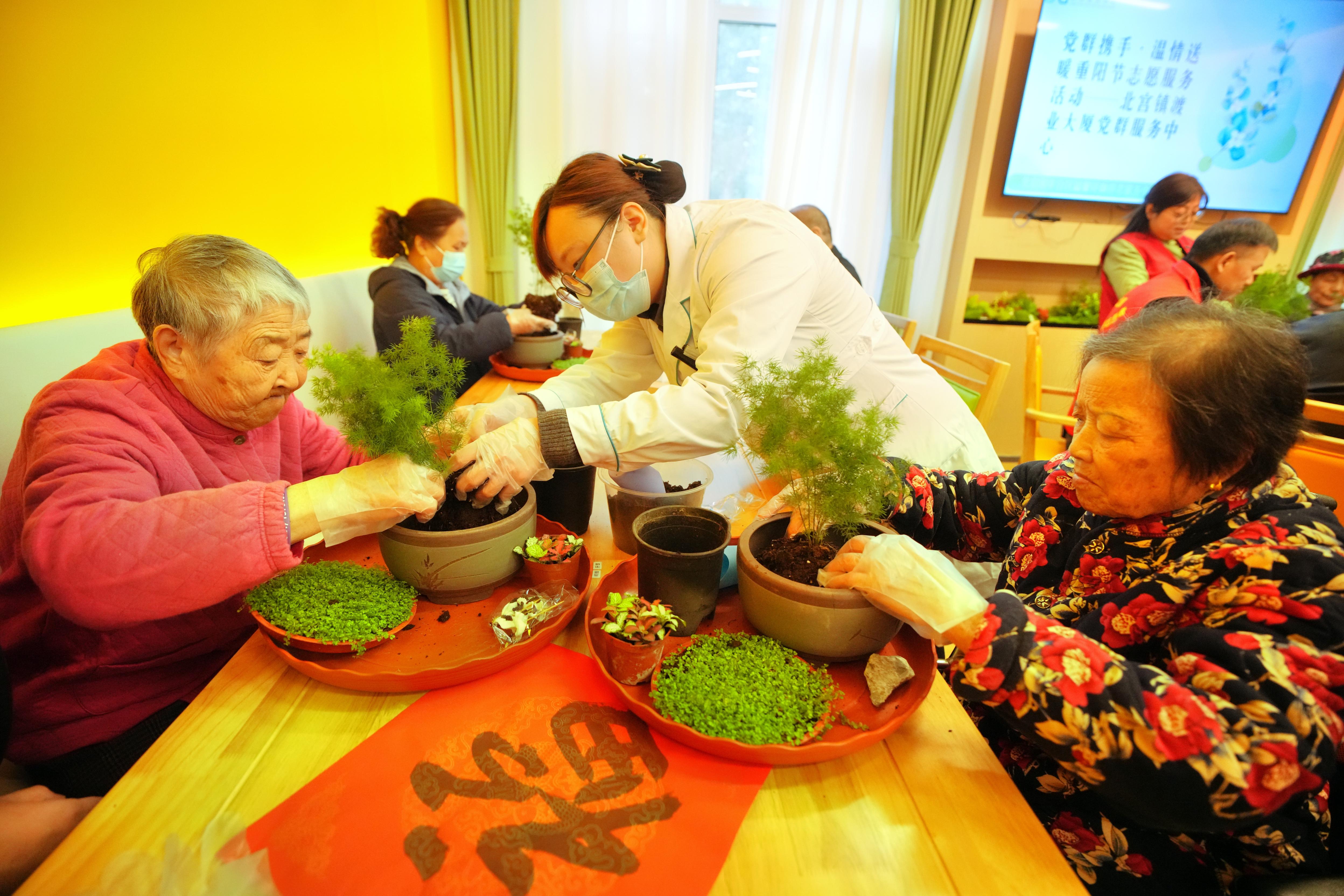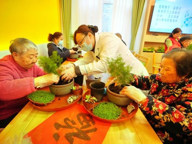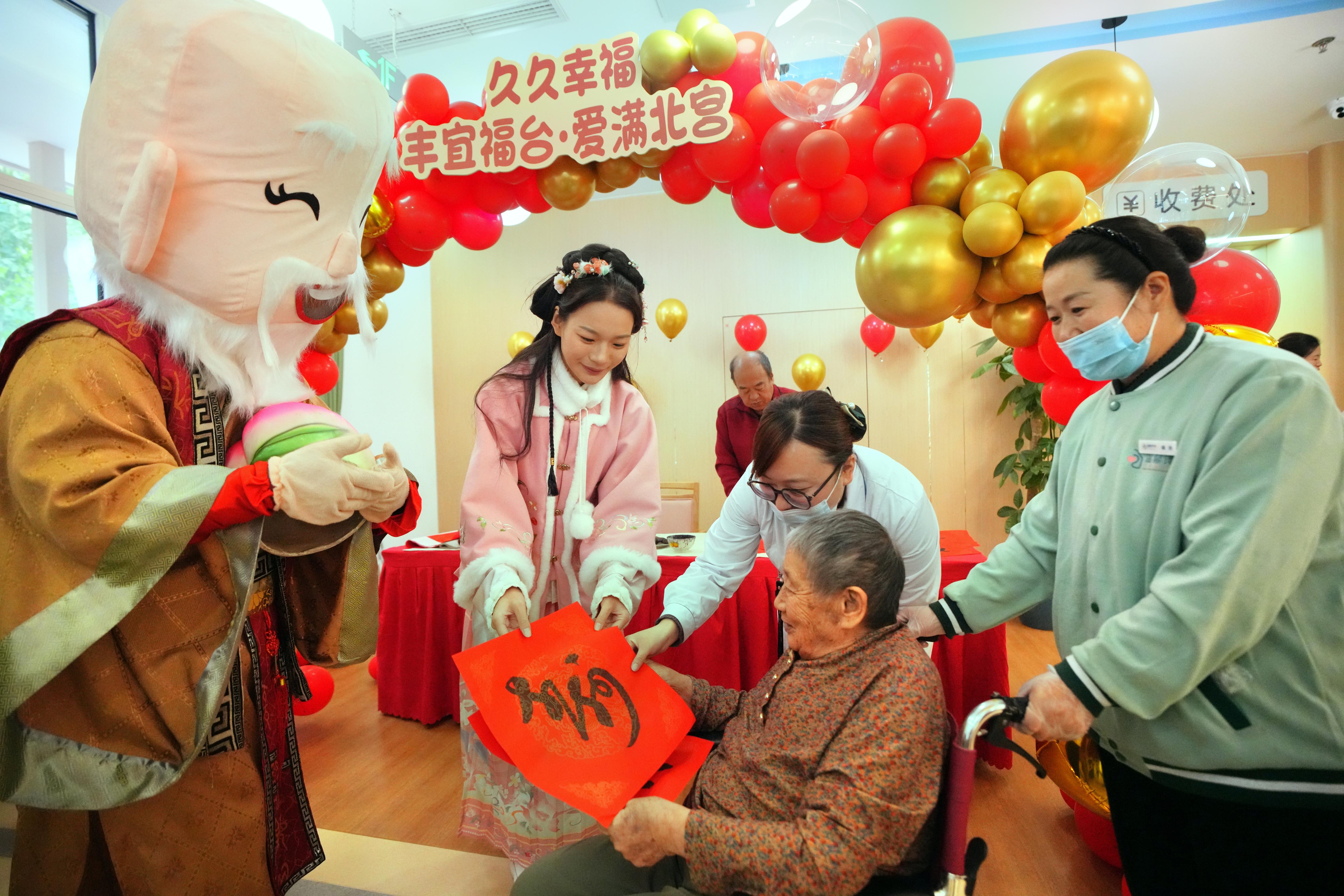 “给您送福啦!”重阳节前夕,丰台区北宫镇养老服务中心节日气息浓厚。书法家现场挥毫泼墨,并由工作人员扮成“寿星”和“麻姑”,为入住这里的老人送“福”。与此同时,餐厅里也是一片热闹景象。志愿者们为老人们带来了一堂精心设计的手工课,手把手地教老人制作盆栽。“这个作品的名字叫‘松鹤延年’,寓意着健康长寿。”志愿者的一番话,让老人乐得合不拢嘴。