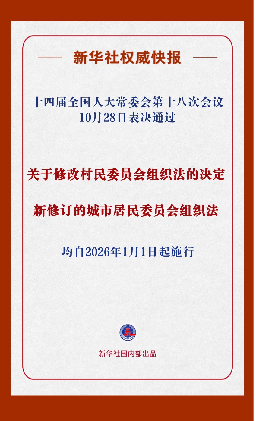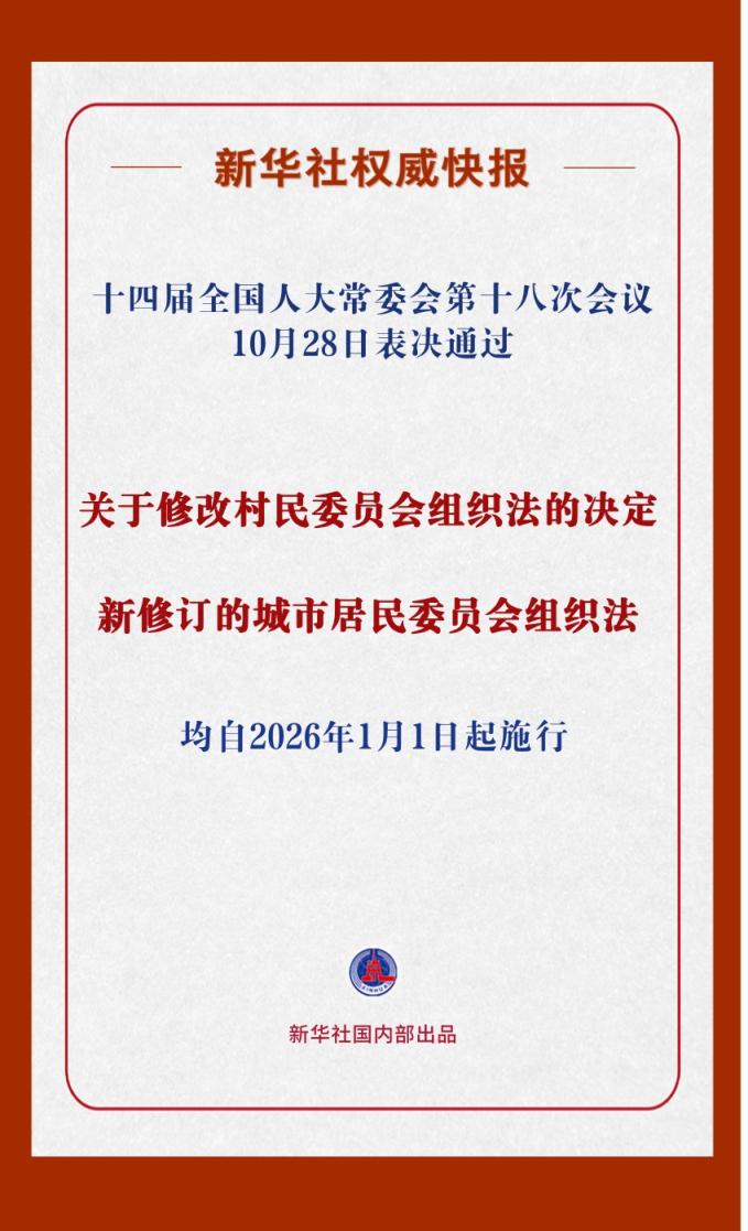 10月28日,十四届全国人大常委会第十八次会议分别表决通过关于修改村民委员会组织法的决定和新修订的城市居民委员会组织法,均自2026年1月1日起施行。