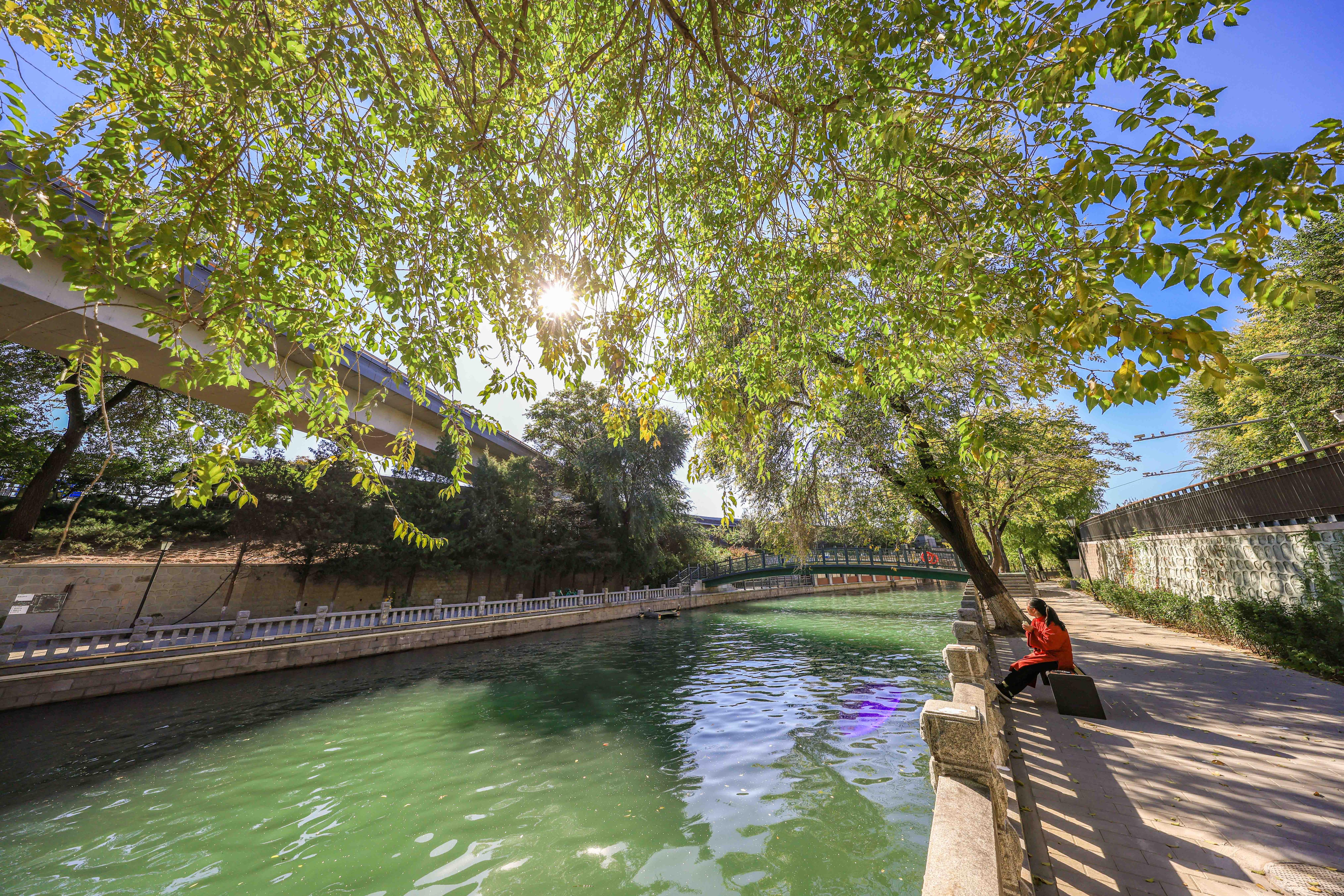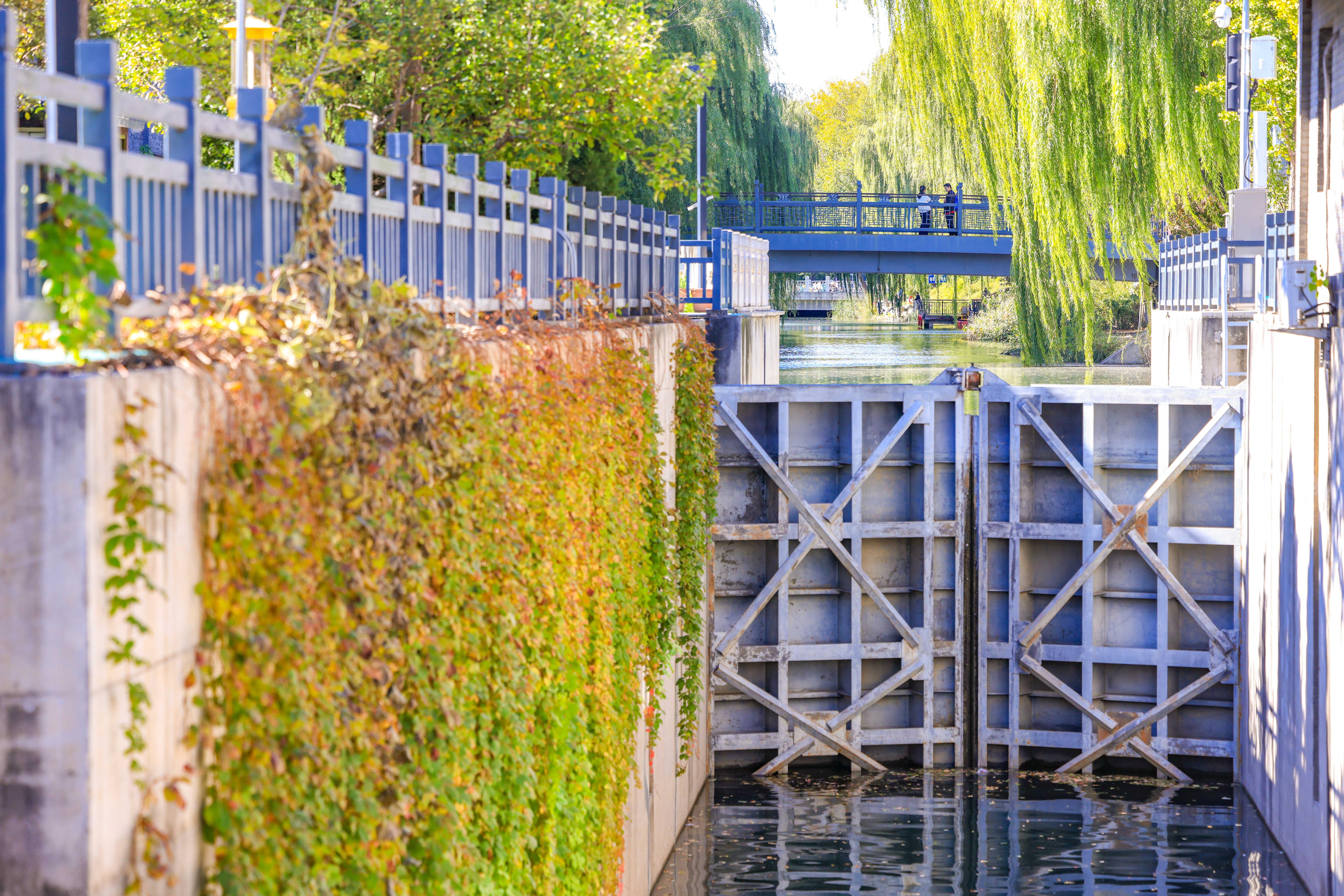 车水马龙的北二环旁,北护城河闹中取静、景色宜人。北护城河新街口与德胜门之间,松林节制闸与一船闸正坐落在此。午后,德胜门桥以西,不少市民沿着河边散步观景。低首,潺潺流水倒映着栈桥与古树;远望,河水与远处的城墙古楼、高架桥相得益彰,别有一番韵味。大家不自觉地拿起手机,定格一幅幅“秋日胜景”。