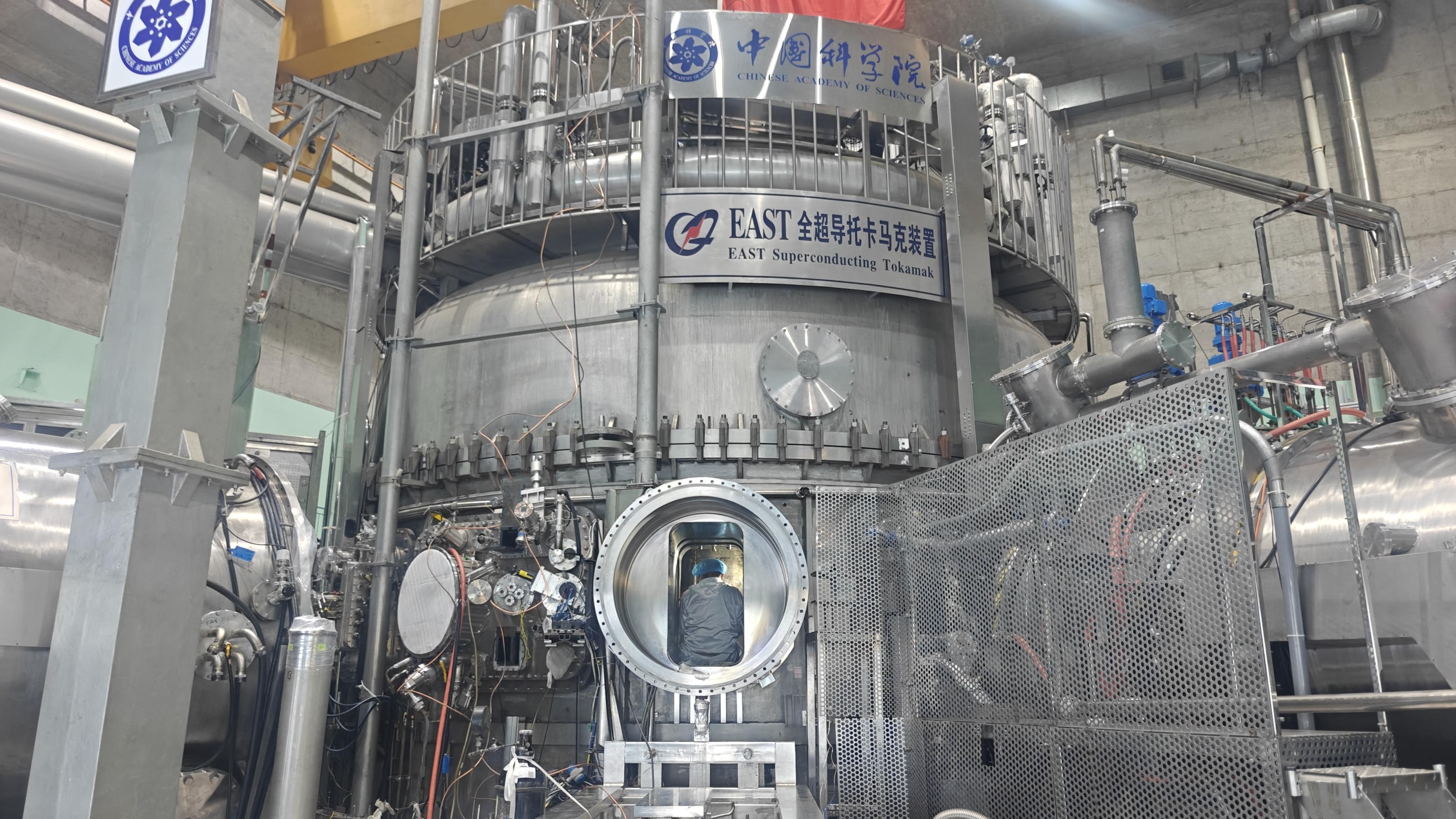 记者在安徽合肥科学岛见到“人造太阳”时,恰逢夕阳给这个官方名称为全超导托卡马克核聚变实验装置(EAST)披上金色外衣。装置舱门大开,身着白衣、头戴蓝帽的工程师们进进出出,头顶龙门吊升降腾挪,脚下切割机嗡嗡作响。这幅火热场景,正是中国聚变事业数年如一日执着追梦的缩影。