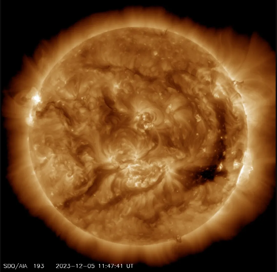 当前太阳的远紫外线波段影像图。图中右下部分的暗色区域正是温度较低、磁力线较为开放的冕洞,它对高能带电粒子流的产生和最近的地磁暴与极光活动有一定贡献。图片来源:美国航天局(NASA)下属太阳动力学天文台(SDO)