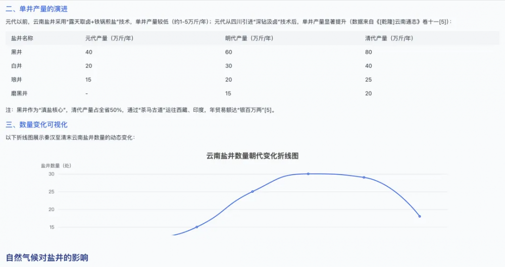 “识典古籍”相关负责人介绍,“深度研究助手”的上线源于一些学者在平台使用过程中的反馈。传统古籍研究需从海量文献中人工提取信息,过程繁琐耗时。AI技术为解决这一痛点提供了可能。学者只需输入研究主题,助手便会在古籍资料中进行穷尽式挖掘与智能分析。以“云南盐井”研究为例,报告不仅梳理出不同朝代单井产量数据,还通过折线图展示盐井数量动态变化,呈现完整研究脉络。