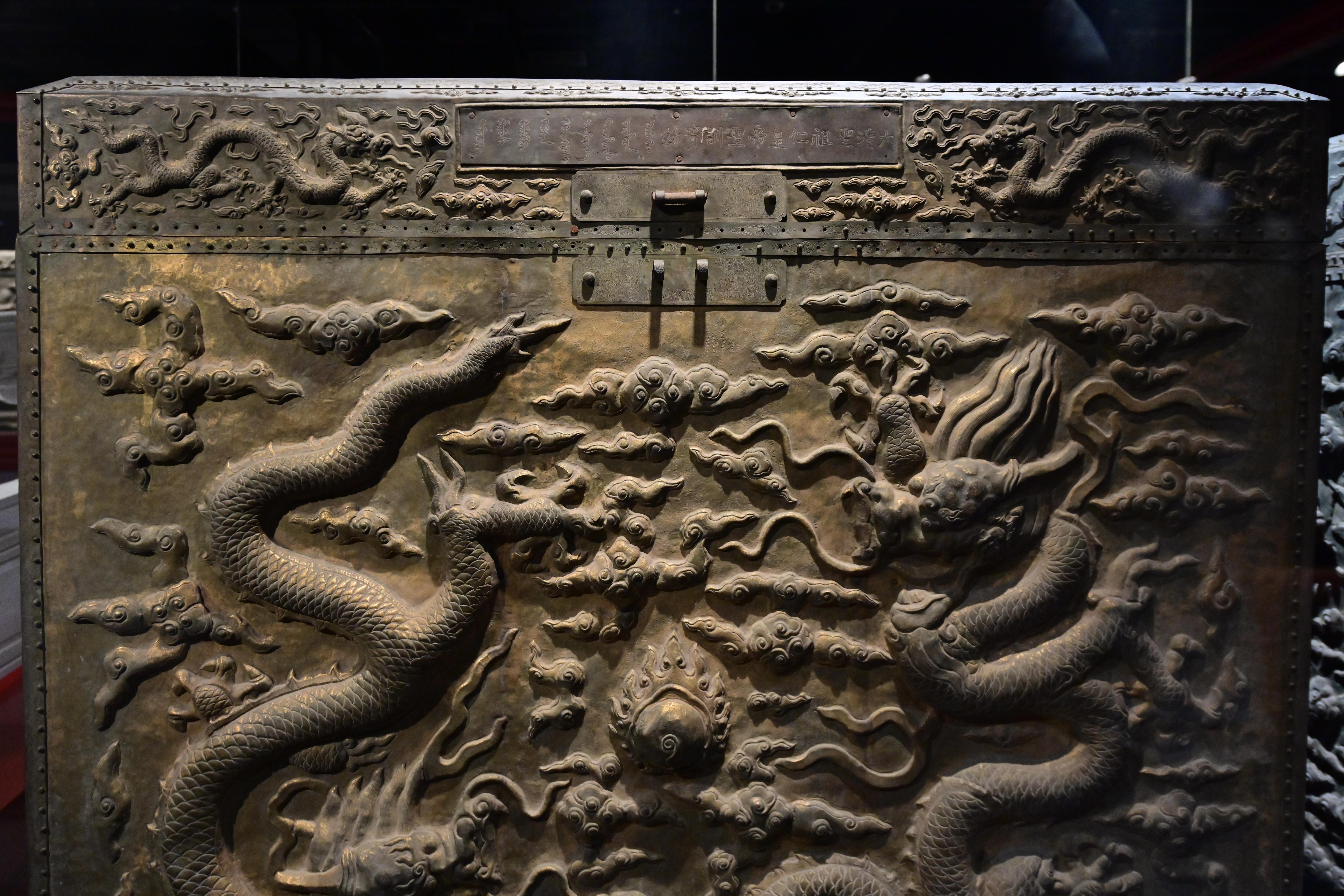 明清金匮都是标准“身材”:长约135厘米、宽约75厘米、高约130厘米。金匮库内,120座金匮整齐排列,宛若列队武士,气势非同寻常。这些档案的“保险柜”均以楠木为胎,外裹铜皮,通体鎏金,可防虫蛀、霉变与高温,利于档案长期保存。观众细看会发现,金匮表面錾刻的云龙图案形态各异,并不是统一姿势。