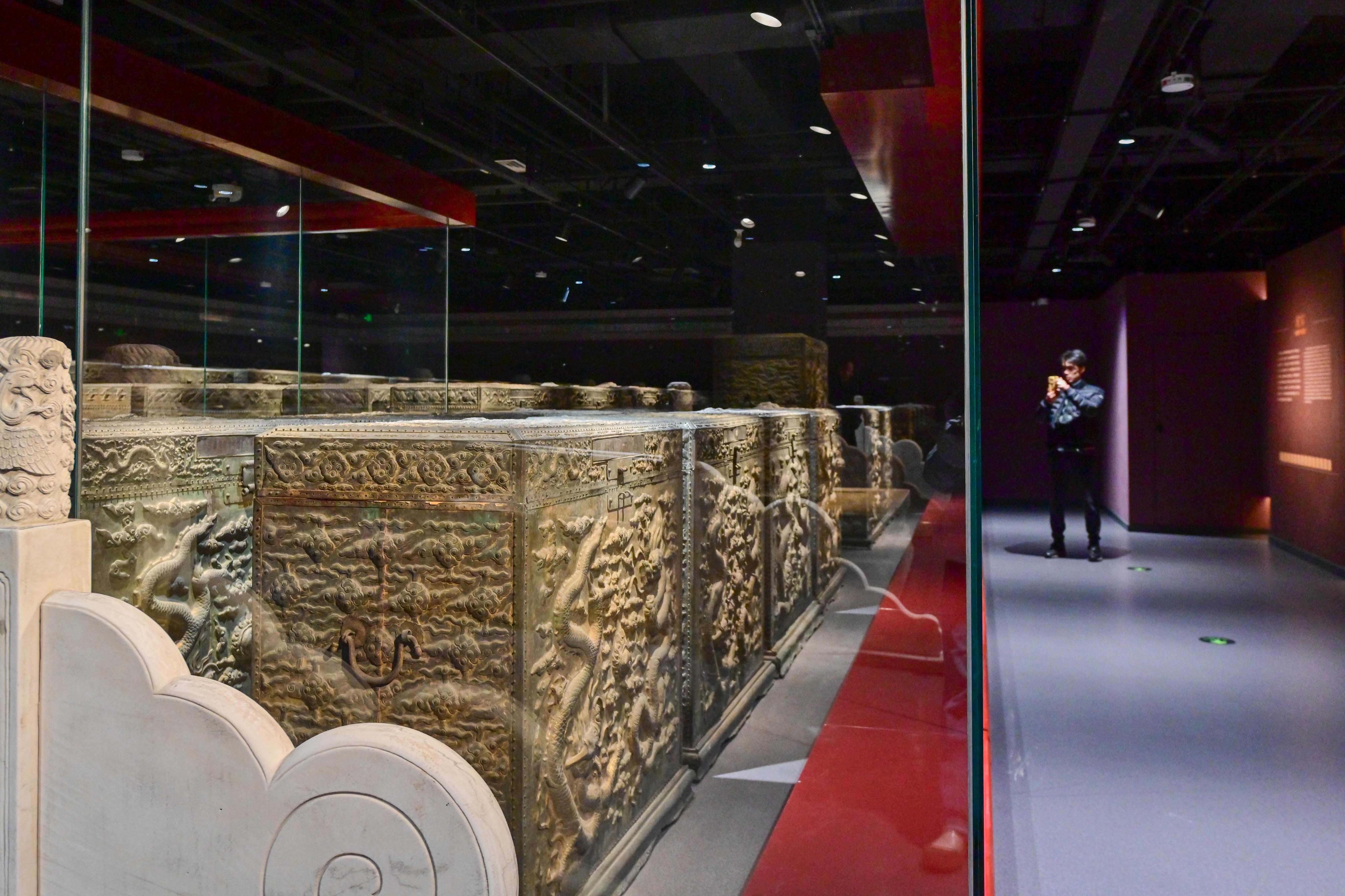 11月17日,中国第一历史档案馆“盛载千秋——明清档案装具陈列”特藏展览展厅“交班”:龙柜库关闭,金匮库开放。120座明清金匮揭面纱。