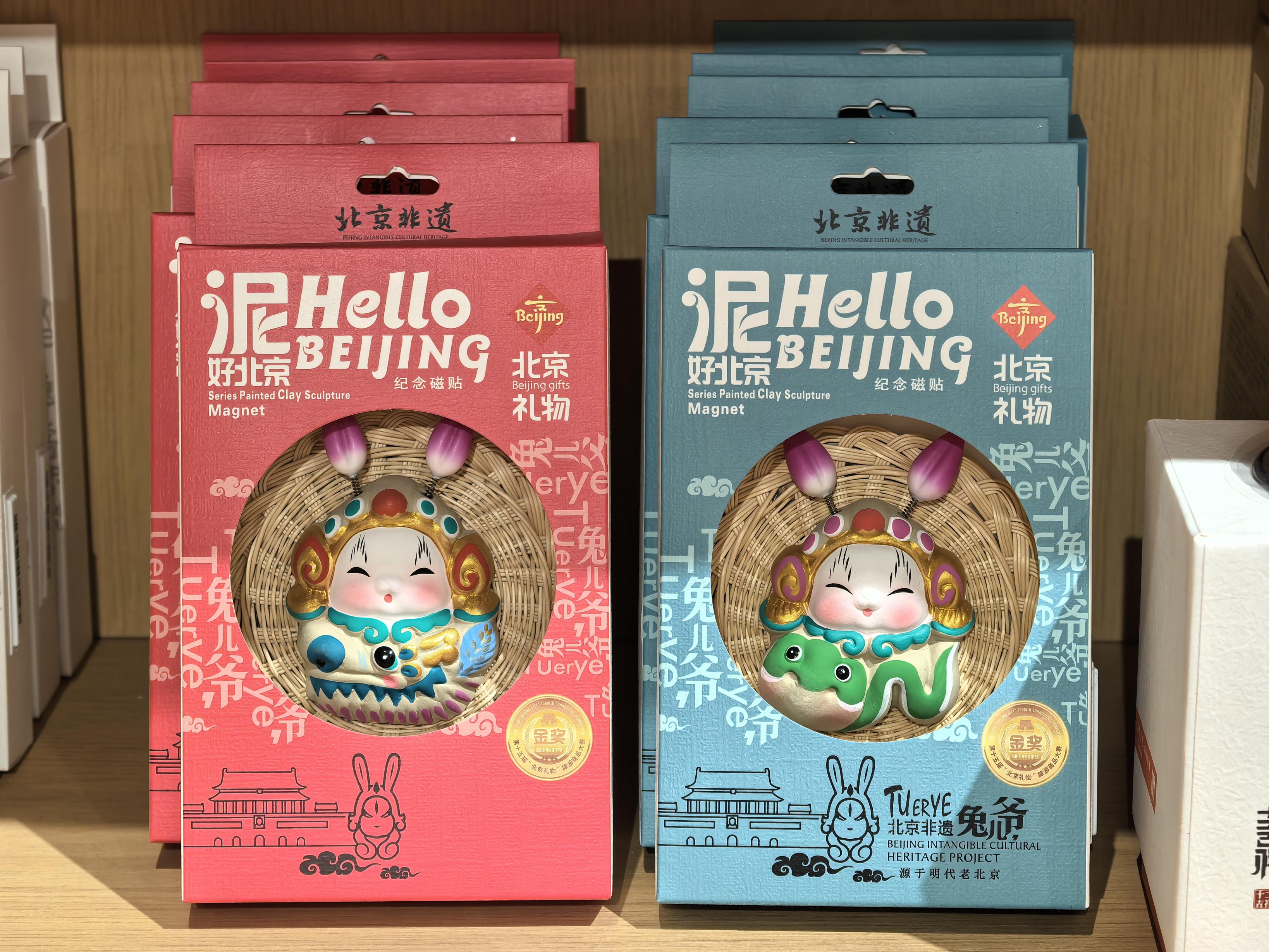 “北京礼物”北京坊集合店里,脸型圆润、笑意盈盈的兔儿爷成为热销款。采用草编底托与泥塑混搭的冰箱贴,更是凭借独特质感跻身“北京礼物”TOP榜单。