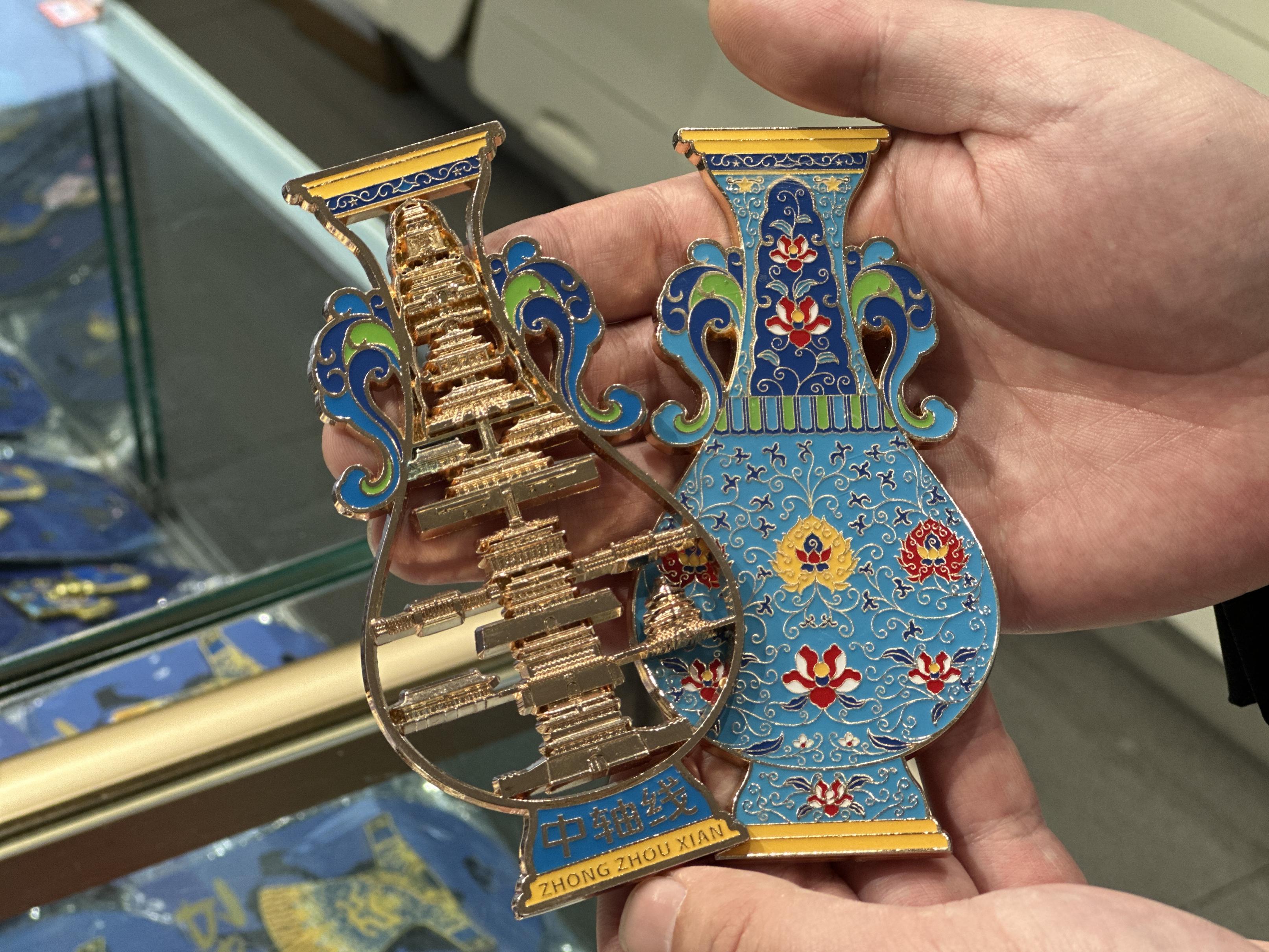 “他们家的中轴线双层冰箱贴我买过了,设计感很强。”中午时分,在北京市珐琅厂一层的京珐文创店里,年轻姑娘小刘边挑选礼物,边向记者推荐。她口中的“中轴线双层冰箱贴”是店里最受欢迎的一款文创。