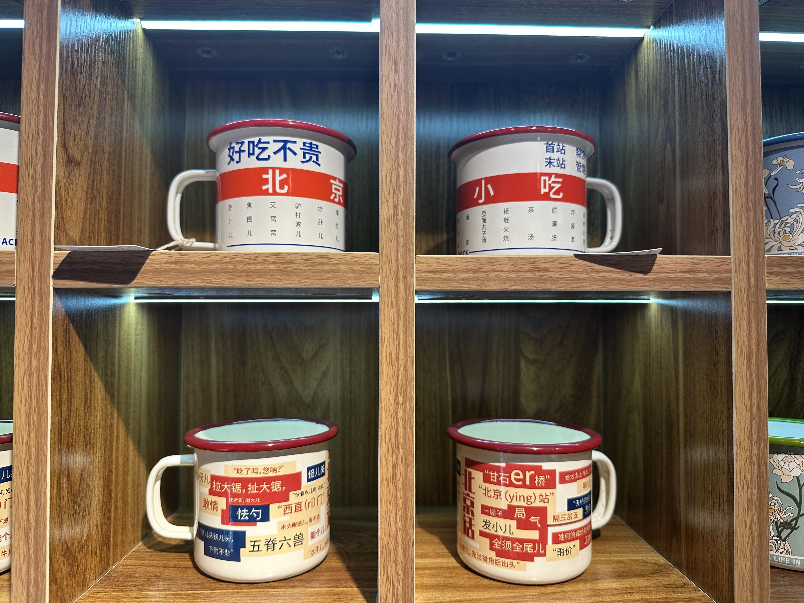 店内一整面醒目的格子墙,陈列着上百种搪瓷缸。缸体上,有的画着铁皮壶、煤气炉等老物件,有的印着“吃了吗,您呐”“甭价”等北京话。一款缸体上复刻的北海白塔下划船场景,让人不自觉会哼唱出“让我们荡起双桨”。“搪瓷缸承载着许多人的记忆,我们希望帮大家找回那些逐渐消失的老北京味儿。”“京味拾光”门店负责人王天羽说。