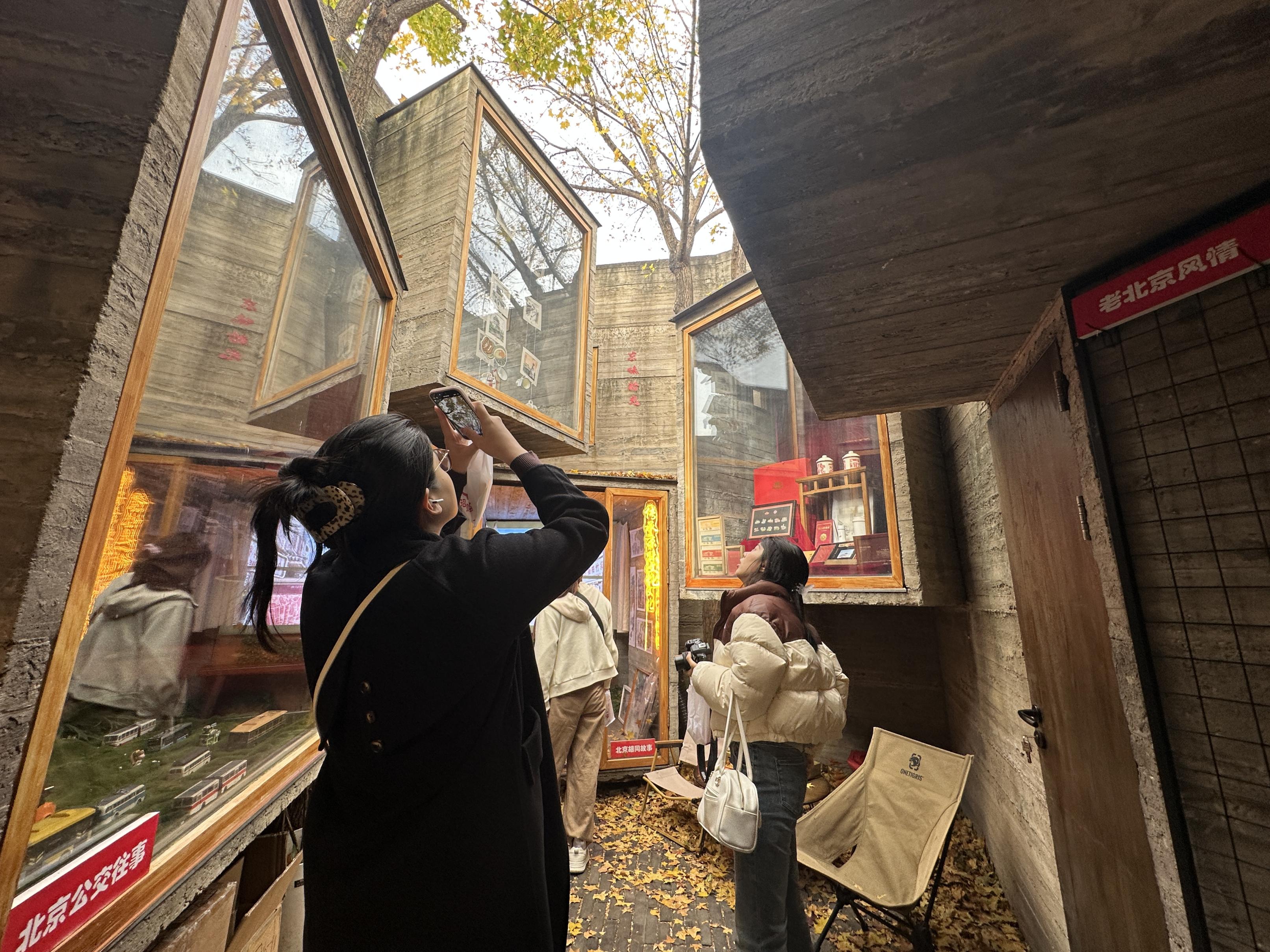 在“京味拾光”小店,别具一格的消费场景也给消费者带来新体验。小店后面,藏着一个小院儿。院子四周高低错落的5块大玻璃窗,打造了小院独特的景致,从下往上仰头拍,仿佛一个“万花筒天窗”。深秋时节,两棵元宝槭由绿变黄,叶子随风飘落,画面唯美浪漫,成为社交媒体上新晋的“网红打卡点”。
