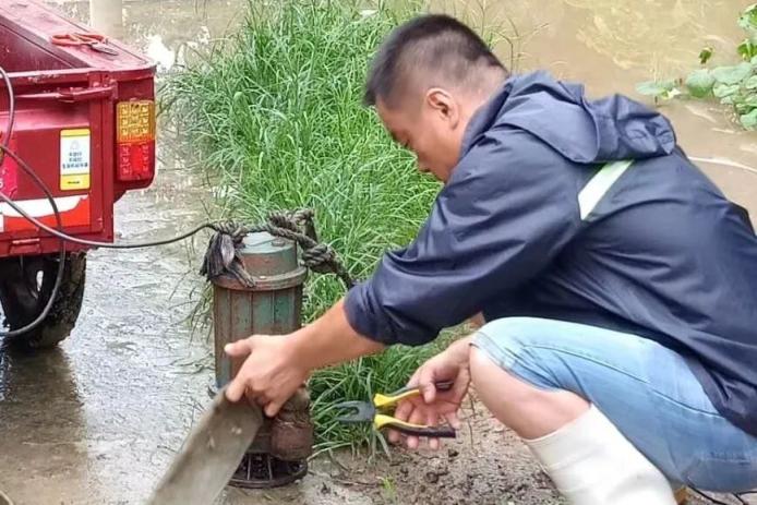 汛期,陈金栋安装抽水泵排除低洼区域积水。
