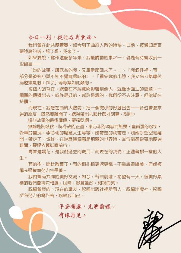 无论如何,言情小说陪伴了一代人的青春和成长。想当年,万盛与狗屋/果树(林白出版社)、禾马、龙吟等出版方共同创造了台湾言情小说的“黄金时代”。然而出版环境和生态在变化,阅读习惯和偏好也在变化,一代人的青春记忆注定会被封装,会被凝结。但就像那封告别信中说的,爱与文字不会消失,总会在我们的生命中以另一种形式继续发光。