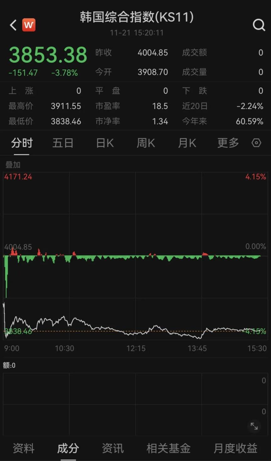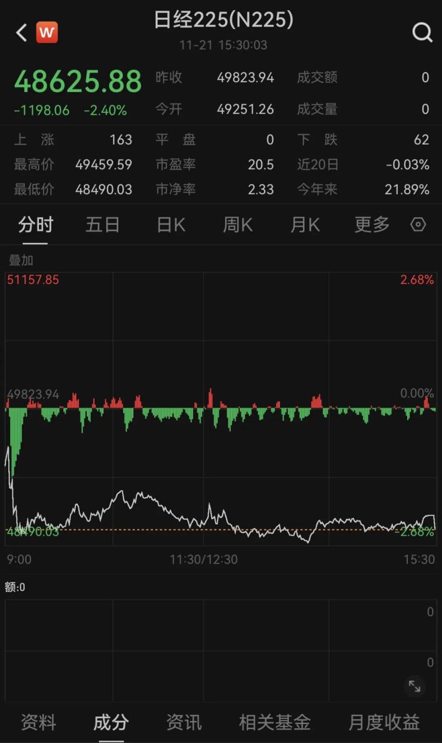21日,Wind数据显示,日经225指数收跌2.40%,报48625.88点。韩国综指收跌3.78%,报3853.38点。