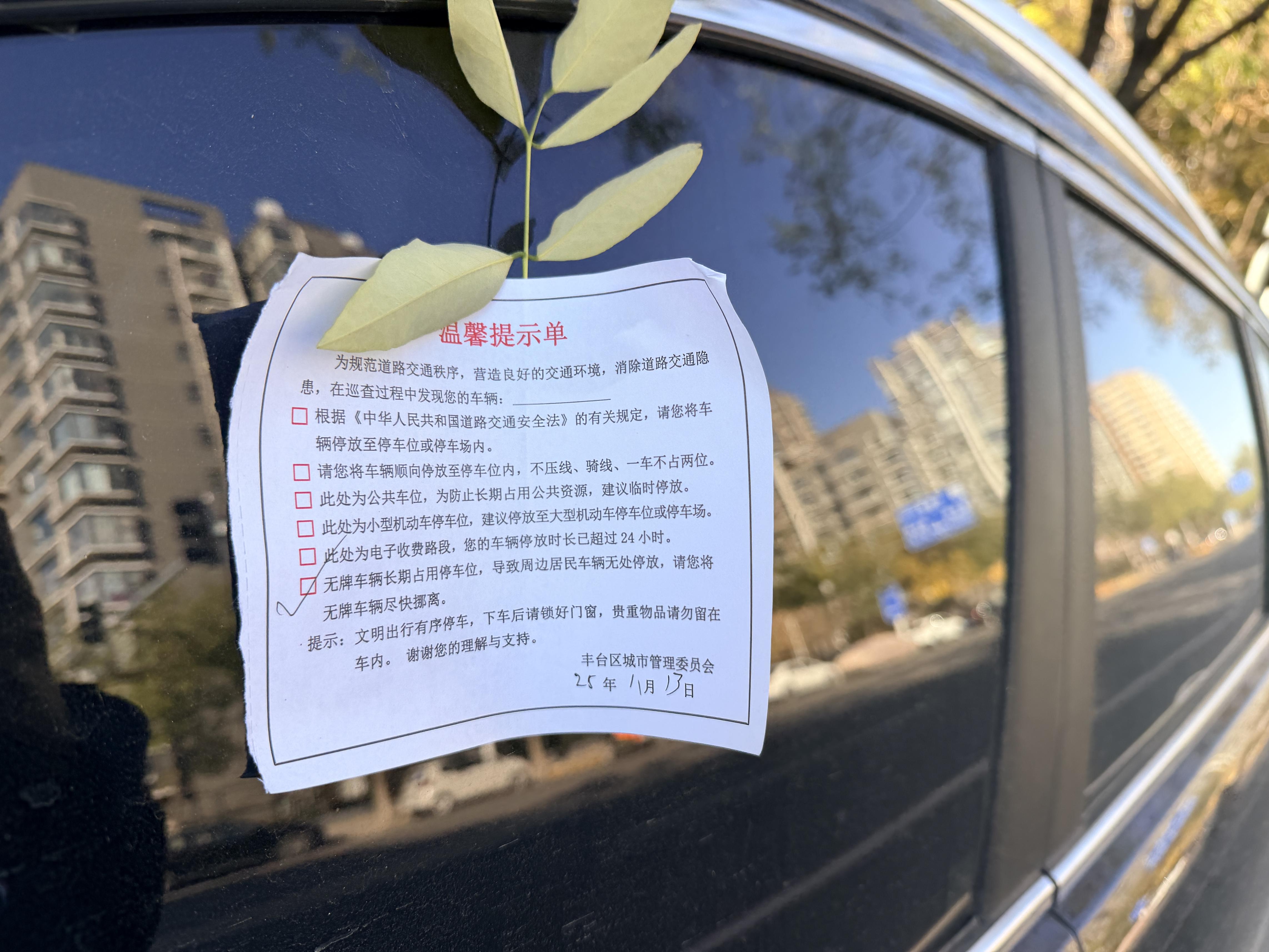 在东西向的康辛路和恒丰路上,6辆无牌车停放在电子收费车位内。其中一辆轿车车身落满树叶和灰尘,显然已停放多日,车窗上贴着一张丰台区城市管理委员会出具的“温馨提示单”,上面写着:“无牌车辆长期占用停车位,导致周边居民车辆无处停放,请您将无牌车辆尽快挪离。”但从车辆状态来看,这份提示单并未起到任何作用。