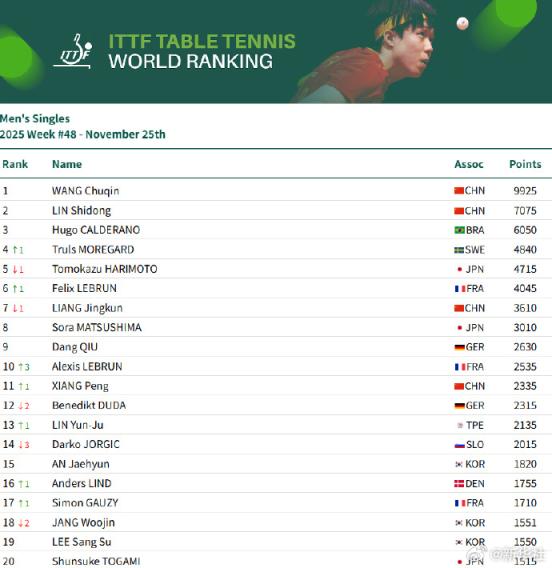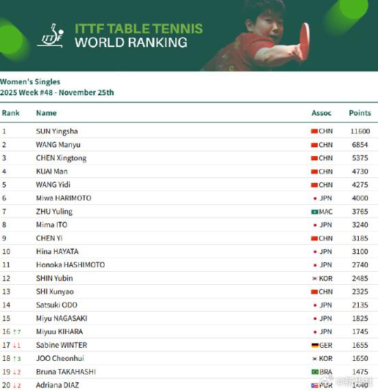 女单方面,孙颖莎11600分世界第一,王曼昱、陈幸同、蒯曼、王艺迪位列第二至第五,陈熠位第九。男单方面,王楚钦9925分排名第一,林诗栋位列第二,梁靖崑位列第七,向鹏位列第十一。
